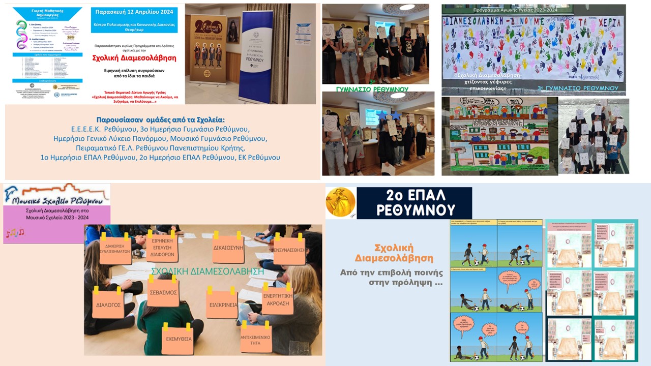 - Την Παρασκευή 12 Απριλίου 2024 παρουσίασαν ομάδες από τα Σχολεία: Ε.Ε.Ε.Ε.Κ. Ρεθύμνου, 3ο Ημερήσιο Γυμνάσιο Ρεθύμνου, Ημερήσιο Γενικό Λύκειο Πανόρμου, Μουσικό Γυμνάσιο Ρεθύμνου, Πειραματικό ΓΕ.Λ. Ρεθύμνου Πανεπιστημίου Κρήτης, 1ο Ημερήσιο ΕΠΑ.Λ. Ρεθύμνου, 2ο Ημερήσιο ΕΠΑ.Λ. Ρεθύμνου, 1ο Ε.Κ. Ρεθύμνου. Παρουσιάστηκαν κυρίως Προγράμματα και Δράσεις σχετικές με την Σχολική Διαμεσολάβηση και την Ειρηνική επίλυση συγκρούσεων από τα ίδια τα παιδιά. Ο Σεβασμιότατος Μητροπολίτης Ξάνθης και Περιθεωρίου κ. Παντελεήμονας και ο Σεβασμιότατος Μητροπολίτης Ρεθύμνης και Αυλοποτάμου κ. Πρόδρομος χαιρέτησαν τους παρευρισκόμενους και την Εκδήλωση. Χαιρετισμό στα παιδιά και τους Εκπαιδευτικούς τους απηύθυνε η Σύμβουλος Μαθηματικών κ. Περυσινάκη Ειρήνη, η οποία συμμετέχει στην Συντονιστική Επιτροπή του Τοπικού Θεματικού Δικτύου Αγωγής Υγείας της ΔΔΕ Ρεθύμνου με τίτλο: «Σχολική Διαμεσολάβηση: Μαθαίνουμε να Ακούμε, να Συζητάμε, να Επιλύουμε...»