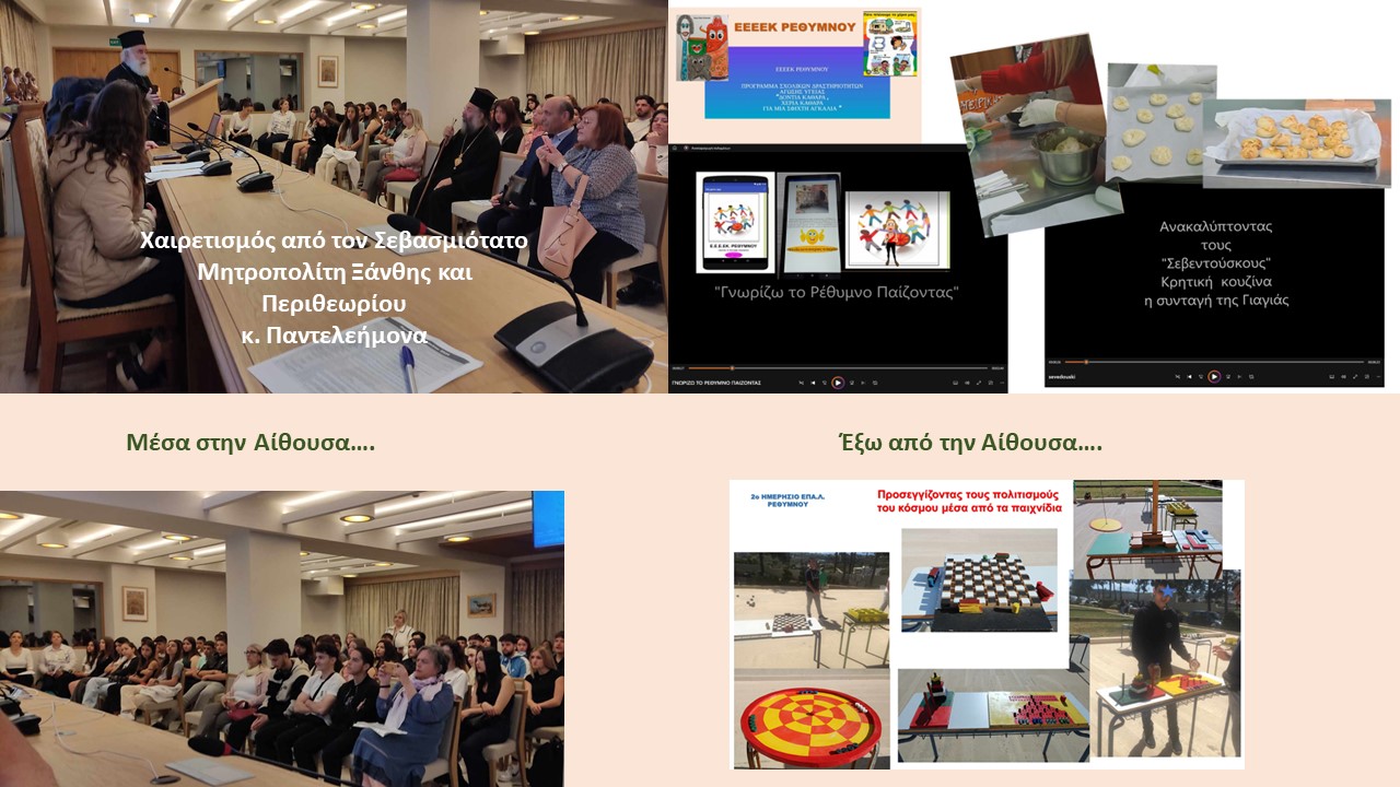 Ομάδες μαθητών και μαθητριών με τους εκπαιδευτικούς τους από τα Σχολεία: 3ο Γυμνάσιο Ρεθύμνου, Γυμνάσιο Ατσιποπούλου, 1ο Γενικό Λύκειο Ρεθύμνου, Γενικό Λύκειο Ατσιποπούλου, Μουσικό Γυμνάσιο Ρεθύμνου, Πειραματικό ΓΕ.Λ. Ρεθύμνου Πανεπιστημίου Κρήτης, Εσπερινό ΕΠΑ.Λ. Ρεθύμνου παρουσίασαν τα Προγράμματα που σχεδίασαν και υλοποίησαν. Την Εκδήλωση τίμησαν με την παρουσία τους και τις παρουσιάσεις των Προγραμμάτων που υλοποιούν, Σχολικές ομάδες από τα Χανιά, το Ημερήσιο Γυμνάσιο Κολυμβαρίου και από την Εύβοια, το 6ο Ημερήσιο Γυμνάσιο Χαλκίδας. Χαιρετισμό στην Εκδήλωση απηύθυνε με μήνυμά του ο Σεβασμιότατος Μητροπολίτης Χαλκίδος, Ιστιαίας και Β. Σποράδων κ. Χρυσόστομος.