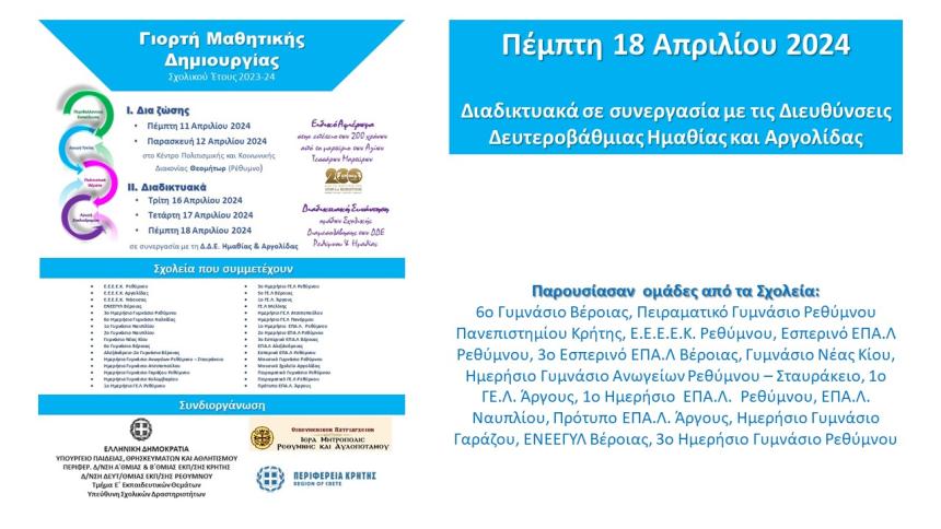 - Την Πέμπτη 18 Απριλίου 2024, τελευταία ημέρα της Εκδήλωσης, παρουσίασαν ομάδες από τα Σχολεία: 6ο Γυμνάσιο Βέροιας, Πειραματικό Γυμνάσιο Ρεθύμνου Πανεπιστημίου Κρήτης, Ε.Ε.Ε.Ε.Κ. Ρεθύμνου, Εσπερινό ΕΠΑ.Λ Ρεθύμνου, 3ο Εσπερινό ΕΠΑ.Λ Βέροιας, Γυμνάσιο Νέας Κίου, Ημερήσιο Γυμνάσιο Ανωγείων Ρεθύμνου – Σταυράκειο, 1o ΓΕ.Λ. Άργους, 1ο Ημερήσιο ΕΠΑ.Λ. Ρεθύμνου, ΕΠΑ.Λ. Ναυπλίου, Πρότυπο ΕΠΑ.Λ. Άργους, Ημερήσιο Γυμνάσιο Γαράζου, ΕΝ.Ε.Ε.ΓΥ.Λ Βέροιας, 3ο Ημερήσιο Γυμνάσιο Ρεθύμνου