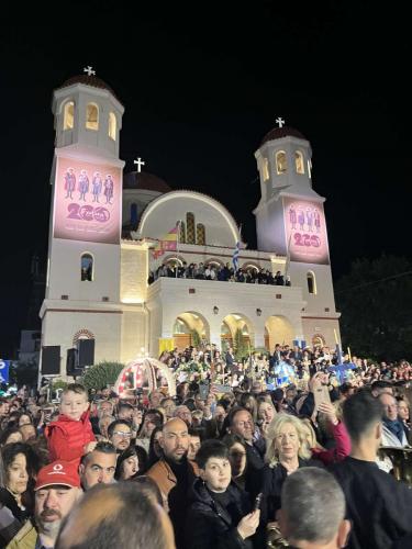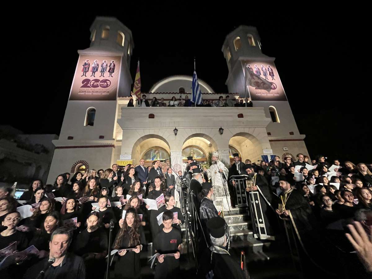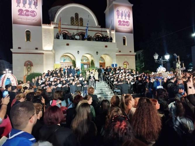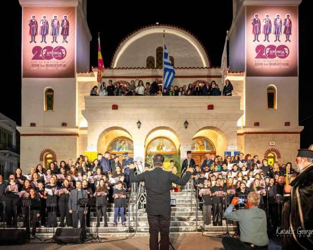 Επίσης, ο Σεβασμιώτατος εξέφρασε τις ευχαριστίες του προς τον «Μουσικό Καρπό» και τον κ. Αντώνιο Μαυράκη, καθώς και προς το όμιλο των μικρών παιδιών, οι οποίοι, στα προπύλαια του Ιερού Ναού των Αγίων Τεσσάρων Μαρτύρων, έψαλαν τα Εγκώμια και απέδωσαν τον -ειδικώς για την επετειακή αυτή χρονιά της συμπληρώσεως 200 ετών από του μαρτυρίου των Αγίων Τεσσάρων Μαρτύρων- γραφέντα και μελοποιηθέντα «Ύμνο των Τεσσάρων Μαρτύρων», δημιουργώντας συναισθήματα συγκίνησης και ενθουσιασμού στις εκατοντάδες των πιστών που κατέκλυσαν την ομώνυμη Πλατεία.