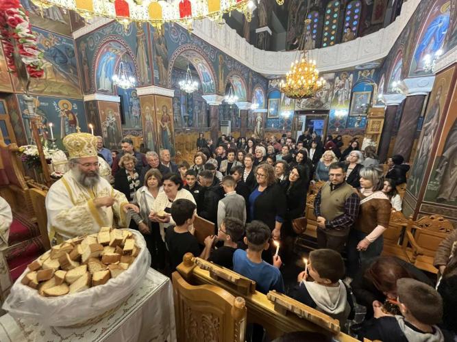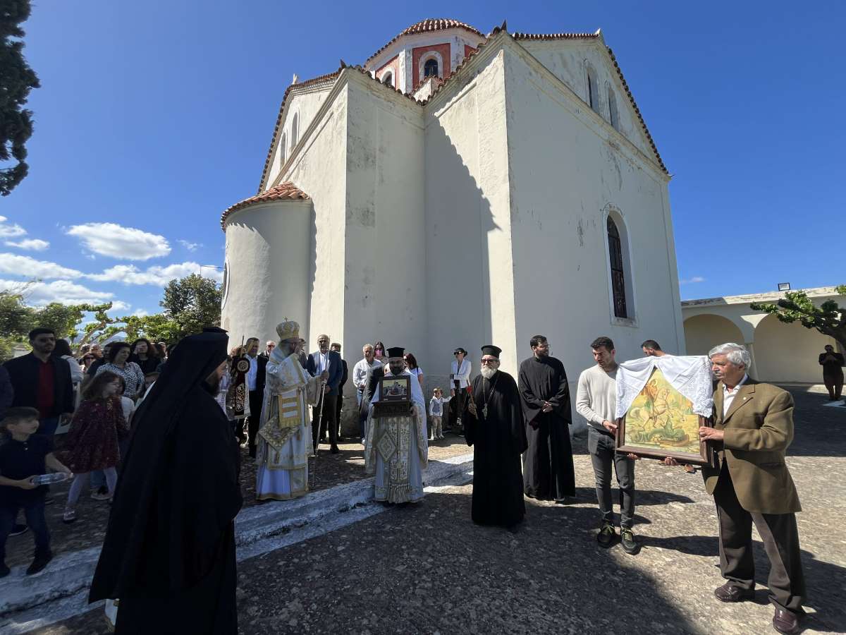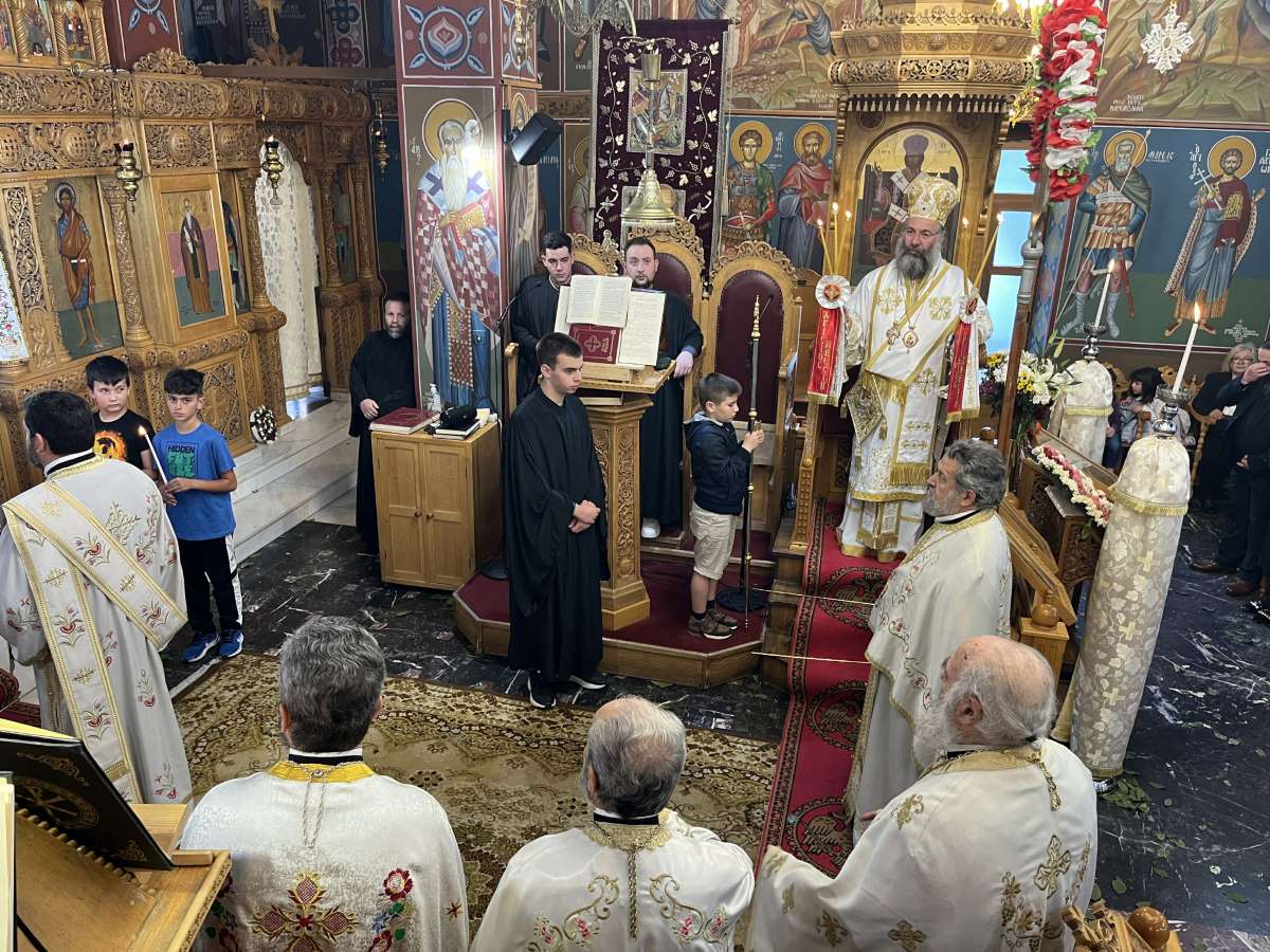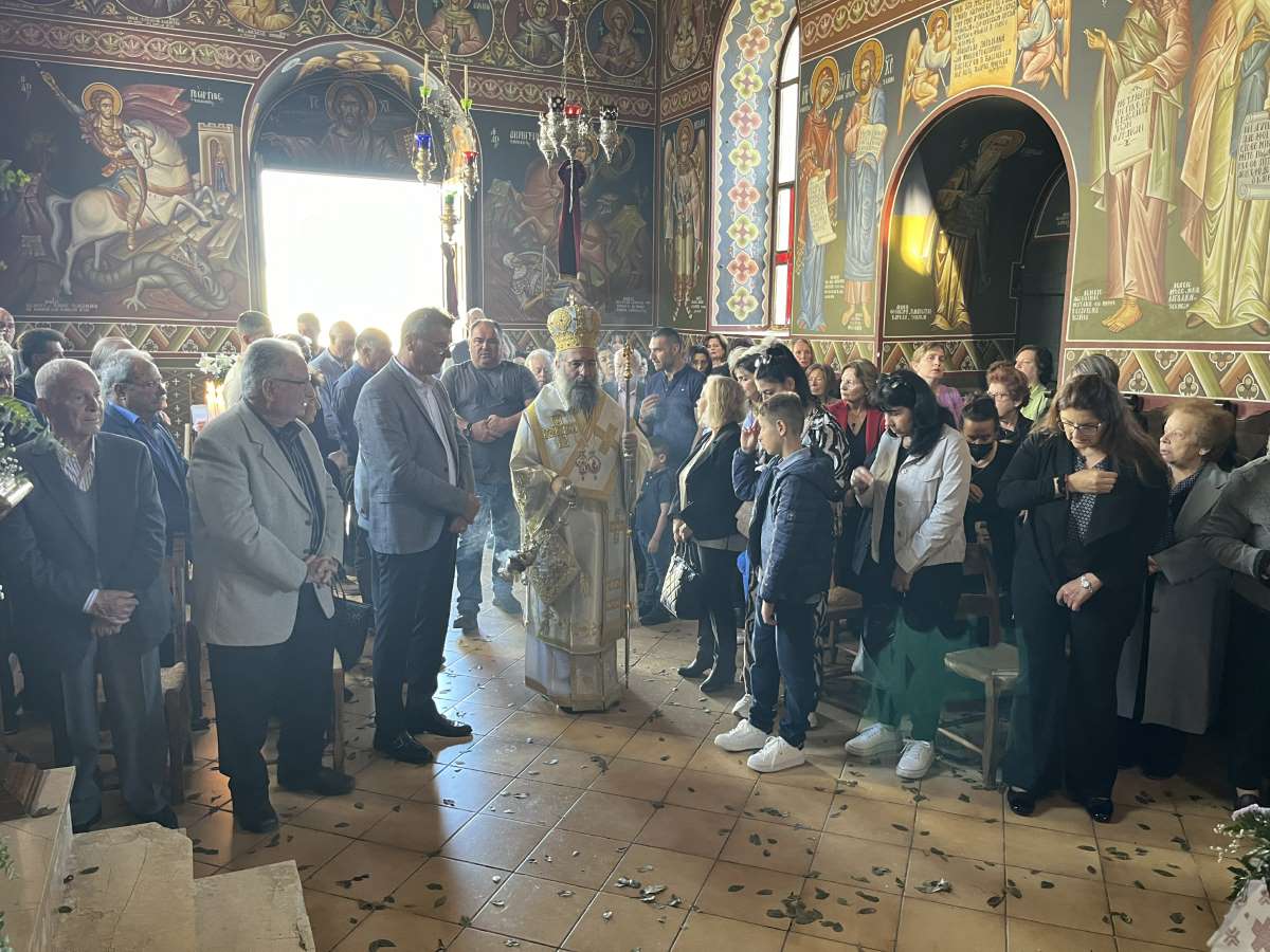 Ο Σεβασμιώτατος, στην προσλαλιά του, αναφέρθηκε στα αναστάσιμα μηνύματα, τα οποία μαρτυρεί η ζωή του Αγίου Μεγαλομάρτυρος Γεωργίου του Τροπαιοφόρου και ευχήθηκε καταλλήλως.