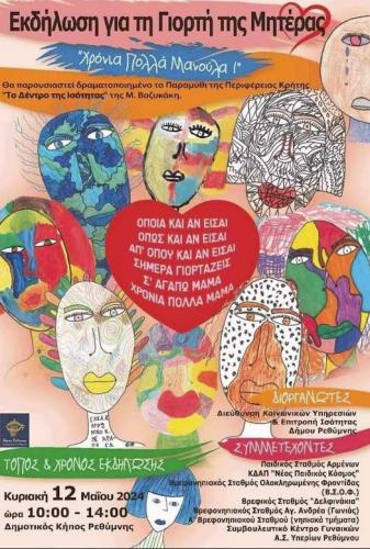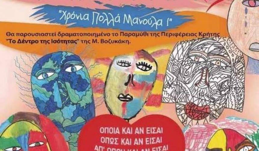 Εργαστήρια, παιχνίδια, παρουσίαση του δραματοποιημένου Παραμυθιού της Περιφέρειας Κρήτης «Το Δέντρο της Ισότητας» της Μ. Βοζυκάκη, από ομάδα εκπαιδευτικών από το Ηράκλειο και πλήθος άλλων ελκυστικών προτάσεων για ψυχαγωγία αλλά και απόδοση τιμής στο πιο σημαντικό πρόσωπο της ζωής μας, τη Μητέρα, θα προσφερθούν στους μικρούς μας συμπολίτες και τους κηδεμόνες τους στη διάρκεια της εκδήλωσης.