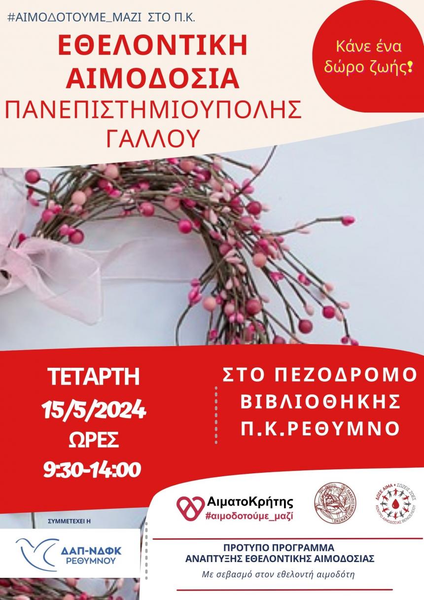 Εθελοντική Αιμοδοσία θα πραγματοποιηθεί στην Πανεπιστημιούπολη Γάλλου στο Ρέθυμνο την Τετάρτη 15/5/2024 ώρες 9:30 έως 14:00 με διοργανωτή τον Παγκρήτιο Σύνδεσμο Εθελοντών Αιμοδοτών και Δωρητών Οργάνων Σώματος "Αιματοκρήτης" τη στήριξη του Πανεπιστημίου Κρήτης και σε συνεργασία με την κινητή μονάδα αιμοδοσίας του Βενιζελείου Νοσοκομείου. Στην αιμοδοσία συμμετέχει η ΔΑΠ ΝΔΦΚ Ρεθύμνου.