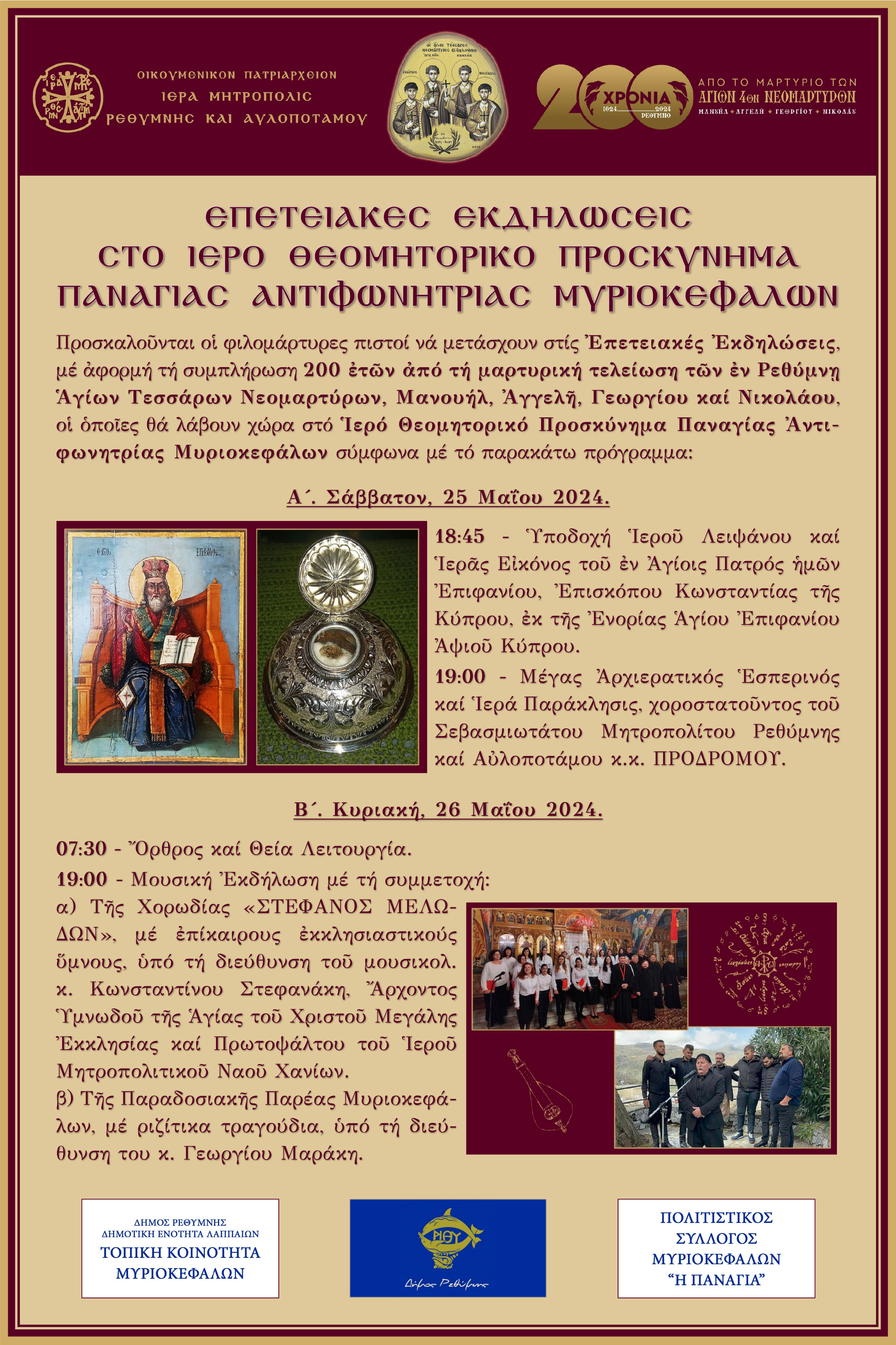 Προσκαλούνται οι φιλομάρτυρες πιστοί να μετάσχουν στις Επετειακές Εκδηλώσεις, με αφορμή τη συμπλήρωση 200 ετών από τη μαρτυρική τελείωση των εν Ρεθύμνη Αγίων Τεσσάρων Νεομαρτύρων, Μανουήλ, Αγγελή, Γεωργίου και Νικολάου, οι οποίες θα λάβουν χώρα στο Ιερό Θεομητορικό Προσκύνημα Παναγίας Αντιφωνητρίας Μυριοκεφάλων σύμφωνα με το παρακάτω πρόγραμμα:
