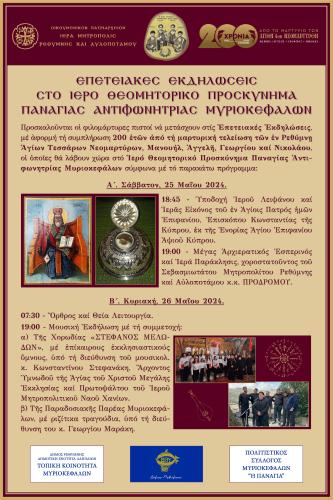 Οι εκδηλώσεις πραγματοποιούνται με τη στήριξη του Δήμου Ρεθύμνης, της Τοπικής Κοινότητας Μυριοκεφάλων και του Πολιτιστικού Συλλόγου Μυριοκεφάλων «Η Παναγία».
