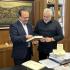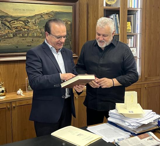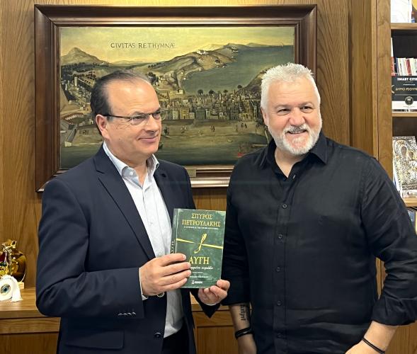 Ο κ. Πετρουλάκης δώρισε στον Δήμαρχο το νέο του βιβλίο «Αυγή» και τον ευχαρίστησε θερμά για την τιμή που του επεφύλαξε ο Δήμος Ρεθύμνης.