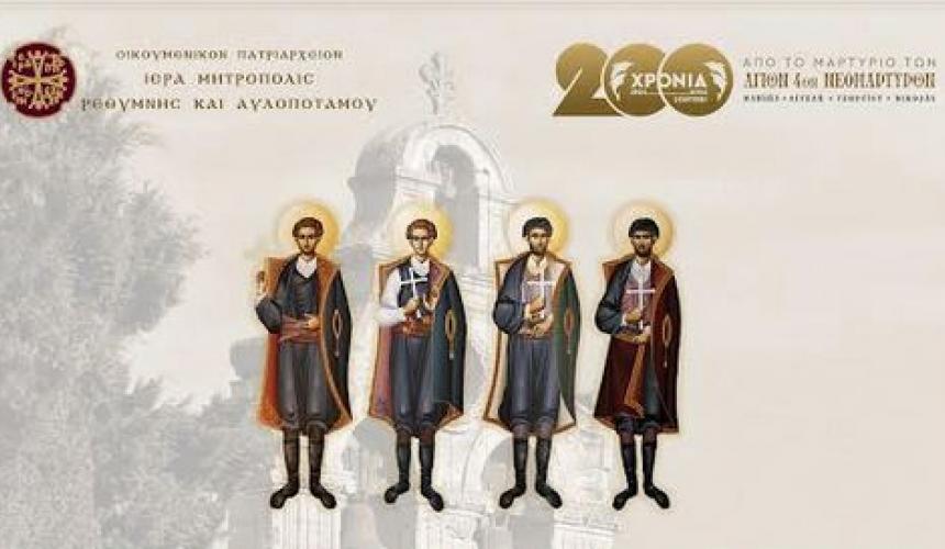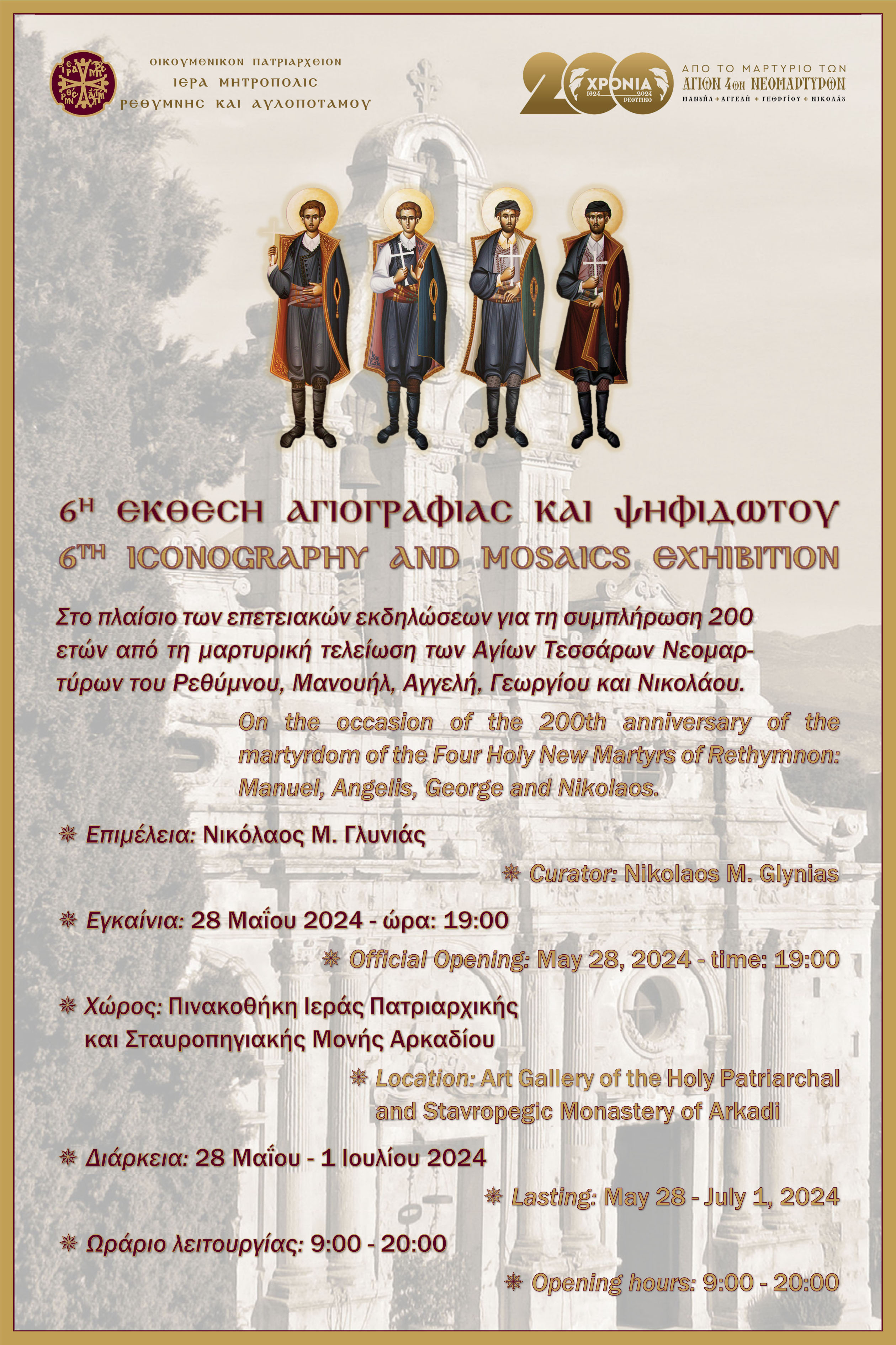 Στο πλαίσιο των επετειακών εκδηλώσεων για τη συμπλήρωση 200 ετών από τη μαρτυρική τελείωση των Αγίων Τεσσάρων Νεομαρτύρων του Ρεθύμνου, Μανουήλ, Αγγελή, Γεωργίου και Νικολάου, η Ιερά Μητρόπολη Ρεθύμνης και Αυλοποτάμου διοργανώνει την 6η Έκθεση Αγιογραφίας, Ψηφιδωτού, Κοινωνικο-Θρησκευτικής Ζωγραφικής, Ξυλογλυπτικής-Μαρμαρογλυπτικής και έργων με Μολύβι και Κάρβουνο, η οποία θα φιλοξενηθεί στην Πινακοθήκη της Ιεράς Πατριαρχικής και Σταυροπηγιακής Μονής Αρκαδίου από την 28η Μαΐου έως και την 1η Ιουλίου 2024.