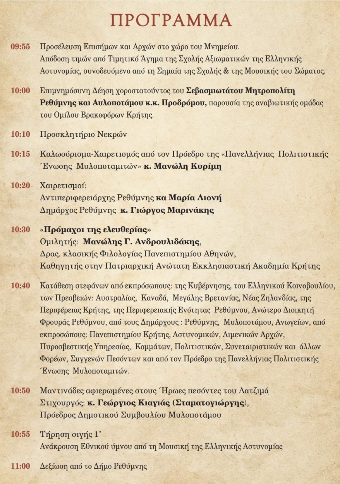 Η Πανελλήνια Πολιτιστική Ένωση Μυλοποταμιτών, σε συνεργασία με την Περιφέρεια Κρήτης, το Δήμο Ρεθύμνης, την Κοινότητα Πρίνου, τον Πολιτιστικό Σύλλογο Πρίνου και την Ενορία Πρίνου, θα τιμήσει την 83η επέτειο της Μάχης της Κρήτης στις 25 Μαΐου 2024, ημέρα Σάββατο και ώρα 10:00 π.μ. στο «Ταφικό Μνημείο Ηρώων Πεσόντων Μυλοποταμιτών» που βρίσκεται στη θέση «Λατζιμά», της Κοινότητας Πρίνου της πρώην επαρχίας Μυλοποτάμου,