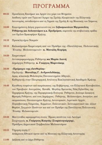 Στην εκδήλωση έχουν προσκληθεί και θα παραστούν: ο Σεβασμιώτατος Μητροπολίτης Ρεθύμνης και Αυλοποτάμου κ.κ. Πρόδρομος, Κληρικοί, εκπρόσωποι της Κυβέρνησης, της Αξιωματικής Αντιπολίτευσης, Κομμάτων, της Περιφέρειας Κρήτης, των Δήμων και του Στρατού, οι πρέσβεις: Βρετανίας, Αυστραλίας και Νέας Ζηλανδίας και Καναδά, οι Αρχές του Νομού, Άγημα με την Ελληνική Σημαία και τη Μoυσική της Ελληνικής Αστυνομίας, εκπρόσωποι Πολιτιστικών, Συνεταιριστικών και άλλων φορέων, καθώς και πλήθος κόσμου.