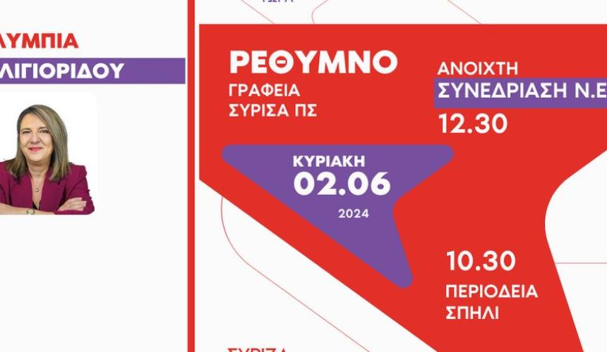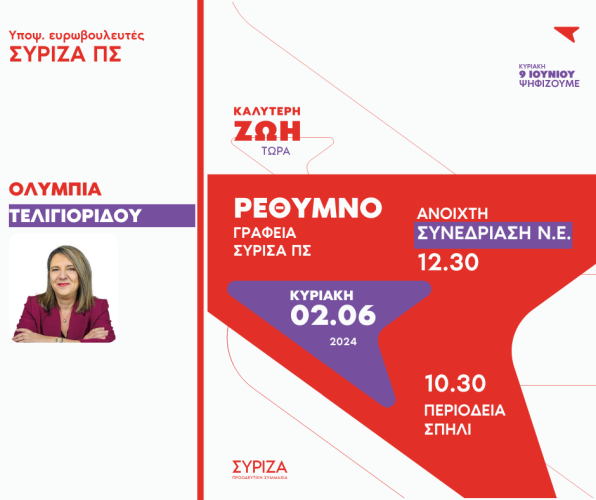 Στο πλαίσιο της προεκλογικής εκστρατείας ενόψει των κρίσιμων εκλογών του Ιουνίου η Νομαρχιακή επιτροπή Ρεθύμνου ΣΥΡΙΖΑ ΠΣ προσκαλεί μέλη και φίλους του κόμματος σε ανοιχτή συνεδρίαση την Κυριακή 02/06 στις 12.30 μμ με εισηγήτρια την υποψήφια ευρωβουλευτή και πρώην υφυπουργό αγροτικής ανάπτυξης κ. Ολυμπία Τελιγιορίδου.