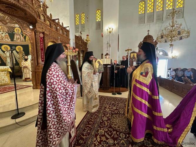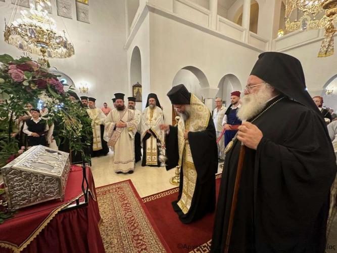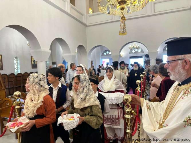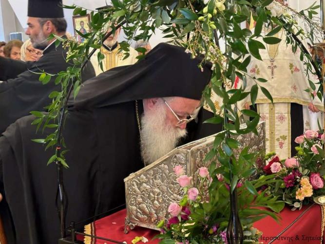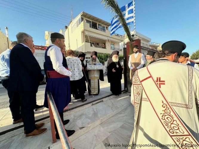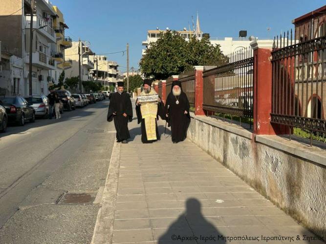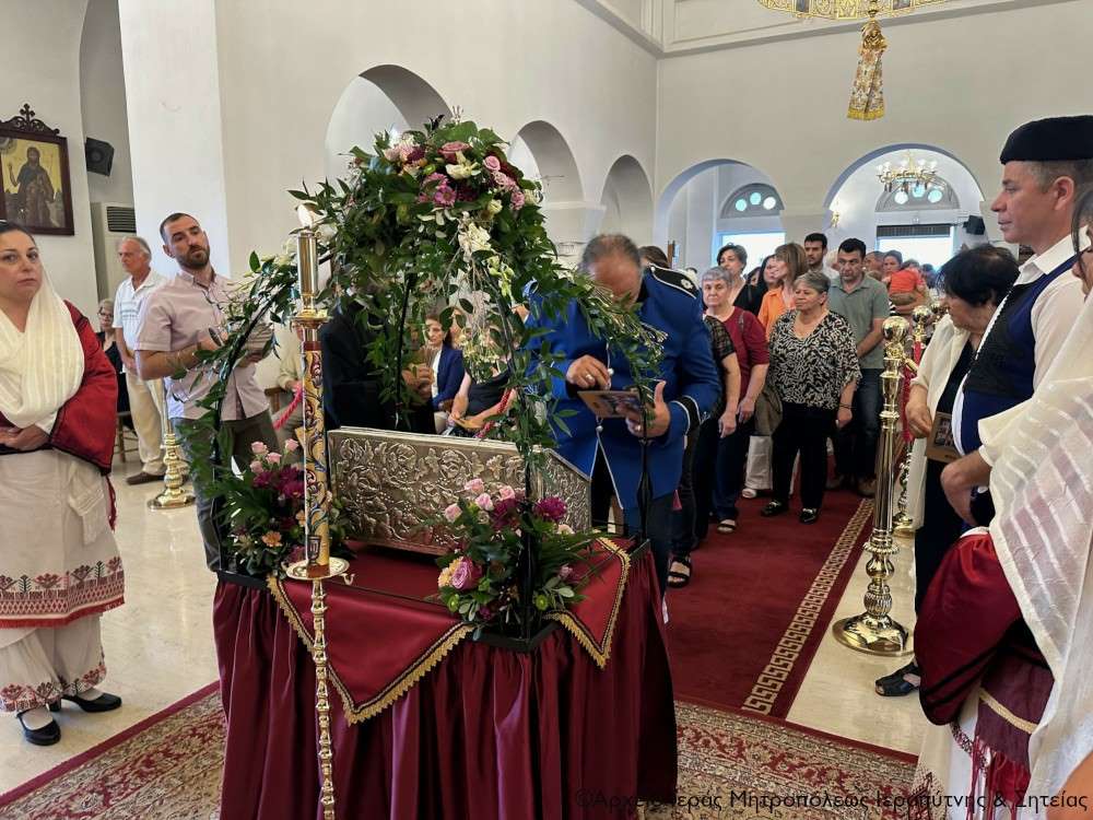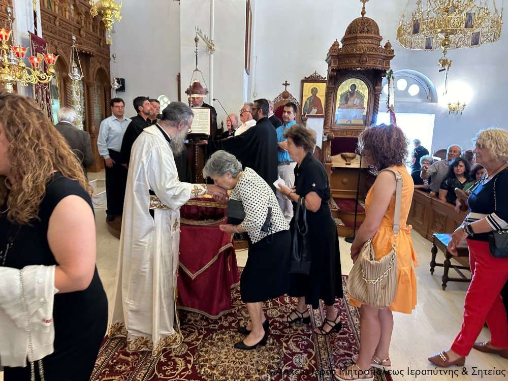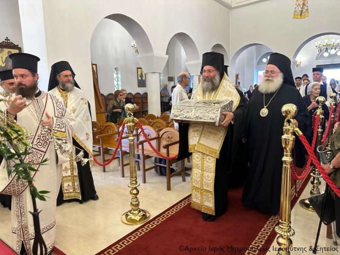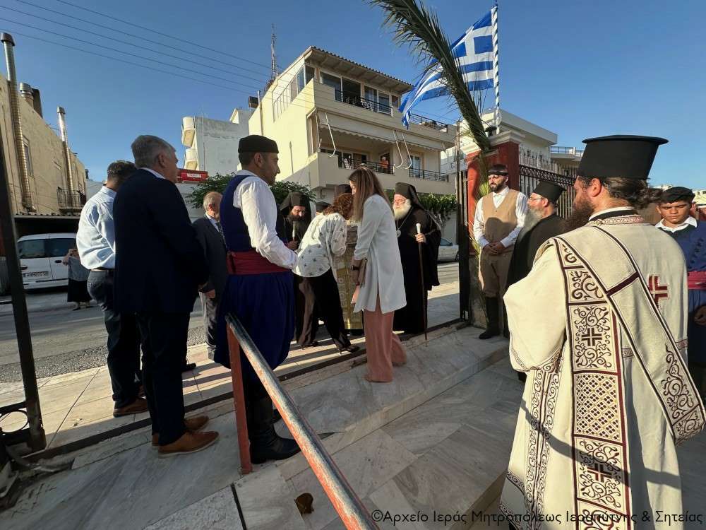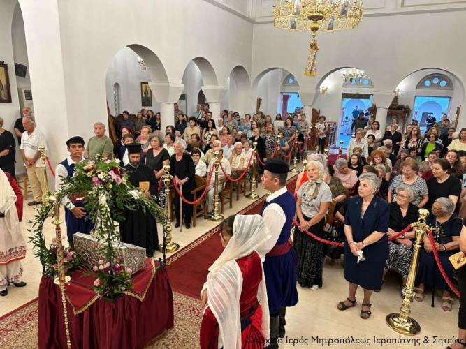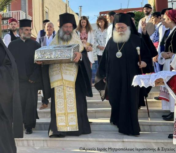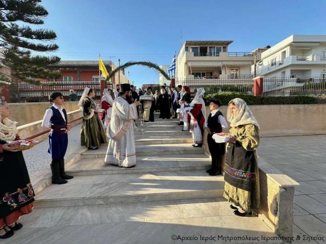 Η υποδοχή πραγματοποιήθηκε από τον Ιερό Κλήρο, τη Φιλαρμονική του Δήμου Ιεράπετρας, μέλη του Πολιτιστικού και Λαογραφικού Συλλόγου Ιεράπετρας «Κρητικός Χορός» ενδεδυμένα με παραδοσιακές κρητικές φορεσιές και τον περιεστώτα λαό στο προαύλιο του πανηγυρίζοντα ιερού ναού, απ’ όπου σχηματίσθηκε πομπή και κατευθύνθηκε στον κυρίως ναό.