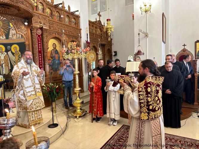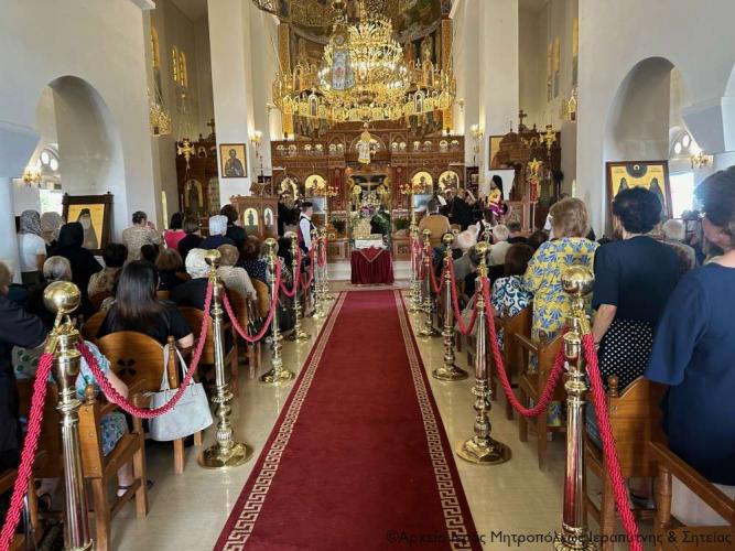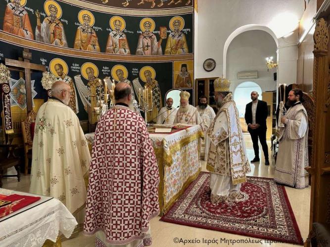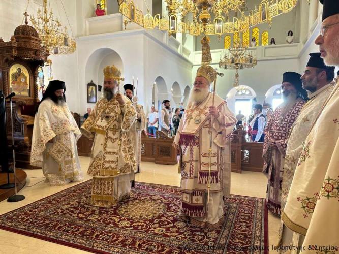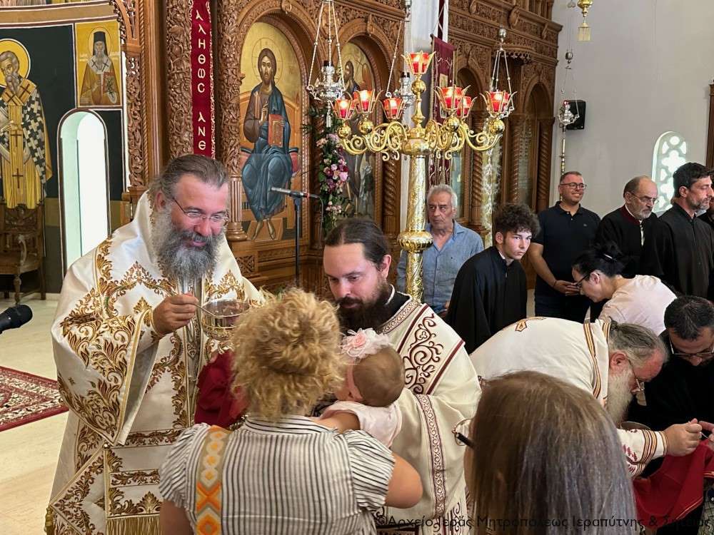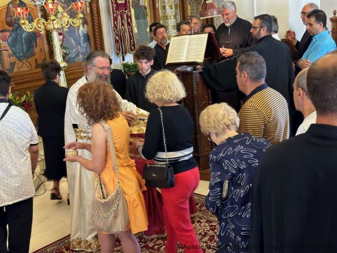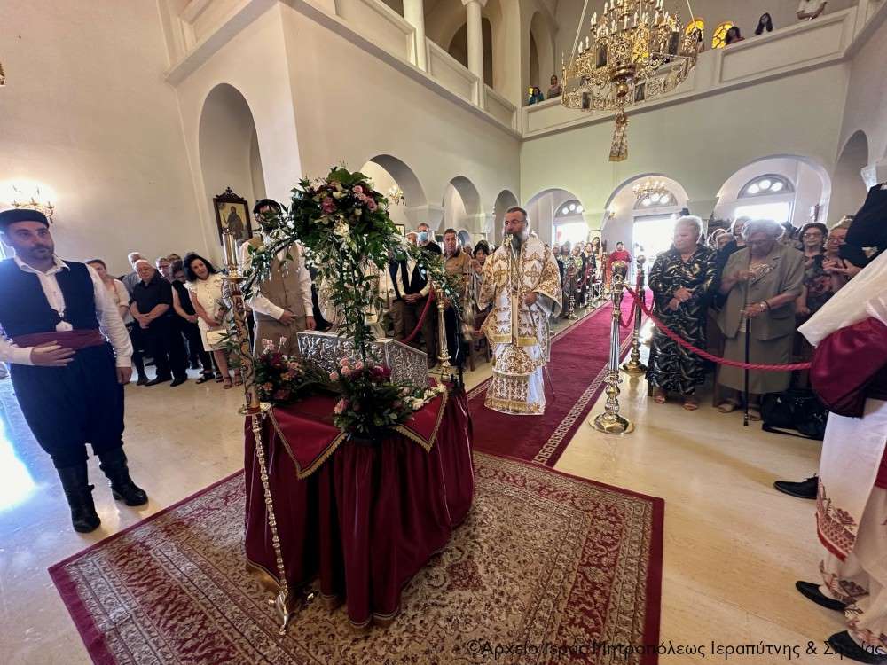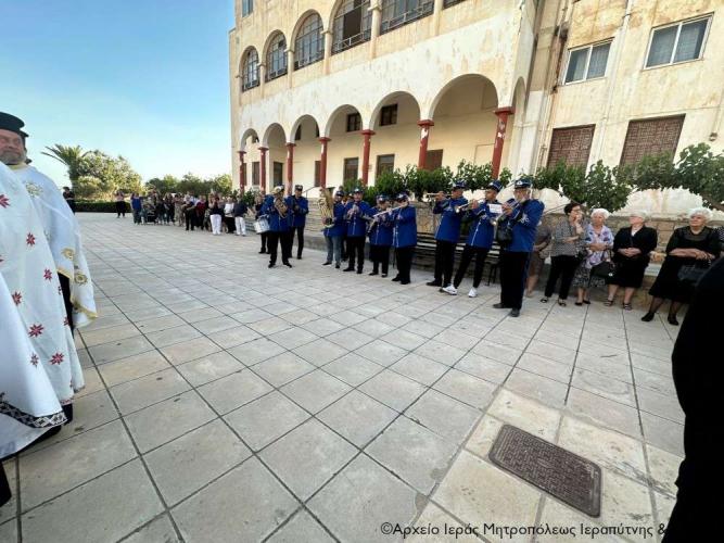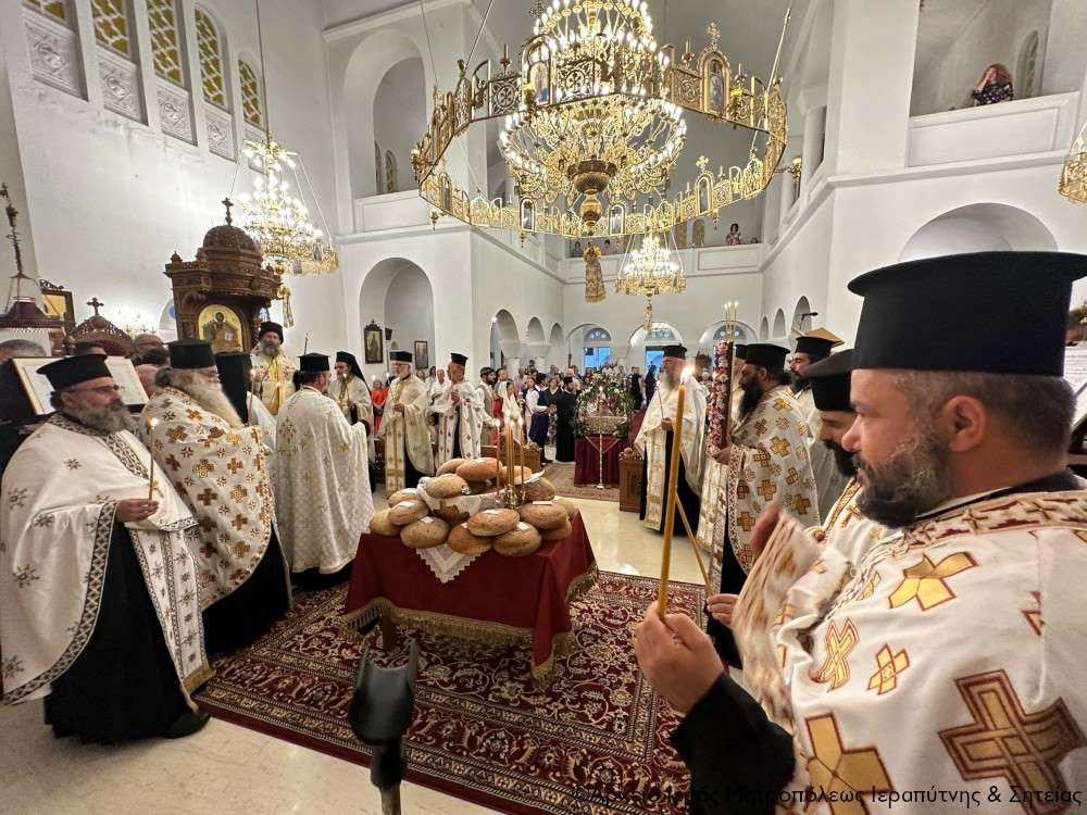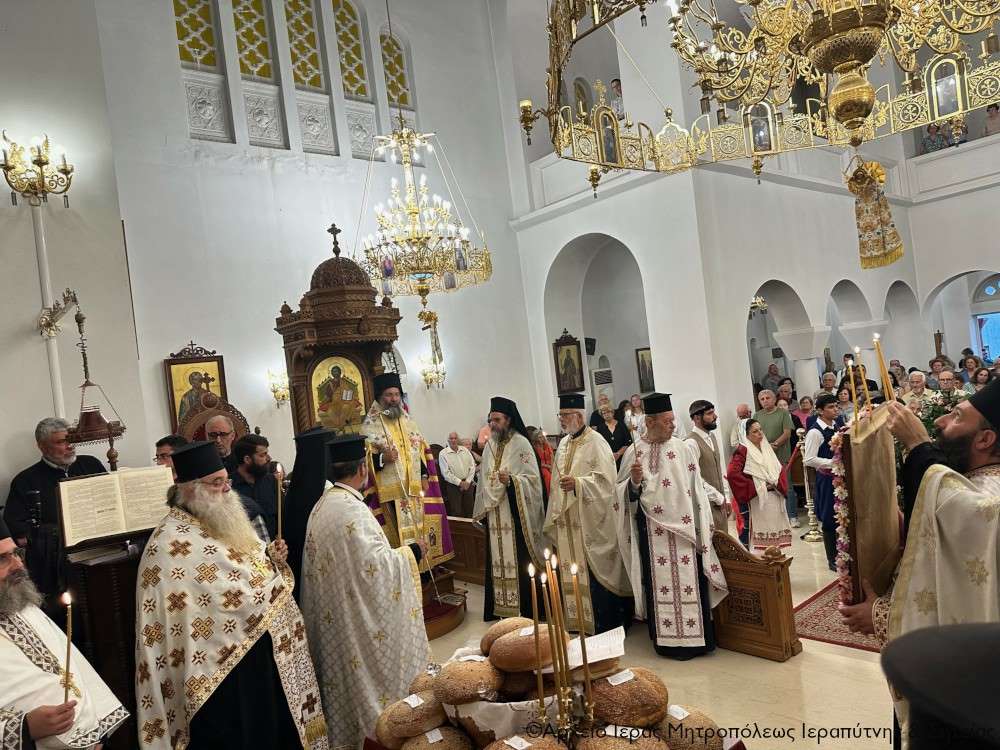 Στην Αρχιερατική Θεία Λειτουργία έλαβαν μέρος ο Πανοσιολ. Αρχιμ. Αμβρόσιος Σκαρβέλης, Πρωτοσύγκελλος της Ιεράς Μητροπόλεως Ιεραπύτνης και Σητείας, ο Πανοσιολ. Αρχιμ. Πορφύριος Αγγελάκης, Εφημέριος και προϊστάμενος του πανηγυρίζοντος ναού, ο Αιδεσιμ. Πρωτ. Δημήτριος Τσακπίνης, Κληρικός της Ι. Μητροπόλεως Ρεθύμνης και Αυλοποτάμου, ο Αιδεσ. Σκευοφύλακας π. Μιχαήλ Ξυδιανός, συνταξιούχος Εφημέριος, ο Αιδ/τος Ιερεύς Γεώργιος Λογκάκης και ο Διάκονος Θεμιστοκλής Μπεϊνάς, ενώ τους ύμνους απέδωσαν θεσπέσια δύο χοροί ιεροψαλτών με επικεφαλής τον Πρωτοψάλτη του Ι. Μ. Ναού Αγ. Γεωργίου Ιεράπετρας και Δ/ντή της Σχολής Βυζ. Μουσικής της Ι. Μητροπόλεως κ. Ιωάννη Αρώνη στον δεξιό χορό, τον οποίο ο Σεβ. Μητροπολίτης κ. Κύριλλος ευχαρίστησε ιδιαιτέρως μαζί με τους ιεροψάλτες του ναού κ. Σταύρο Δασκαλάκη και κ. Εμμανουήλ Καραλάκη.