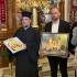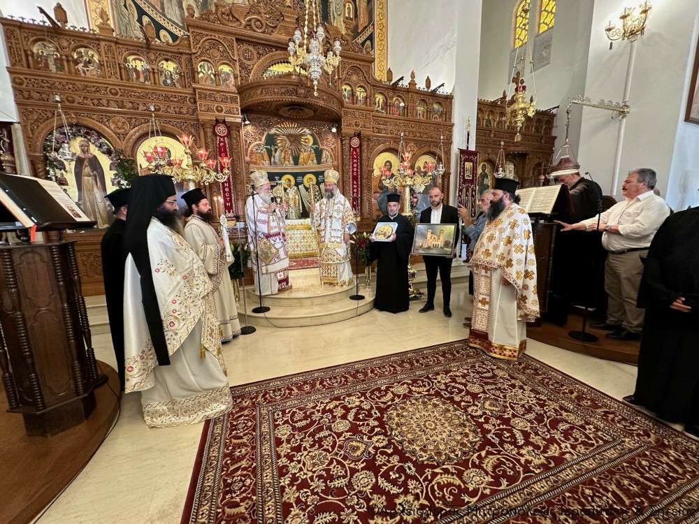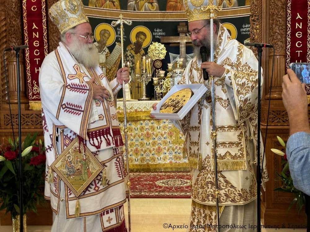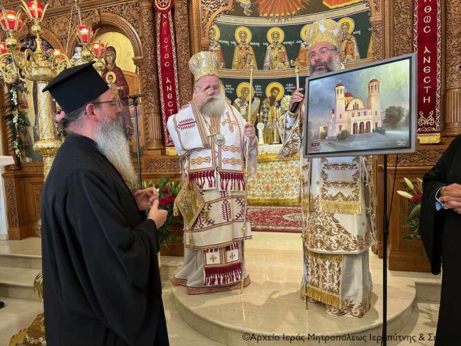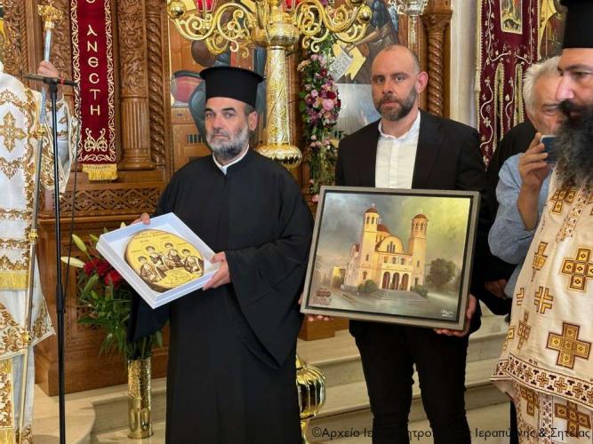 Τέλος πρόσφερε στον Σεβ. Αδελφό του κ. Κύριλλο, «τον Δεσπότη που είναι ως ο διακονών» -όπως χαρακτηριστικά είπε- μια εικόνα από ξύλο ελιάς του Ρεθύμνου, ζωγραφισμένη από το Ρεθυμνιώτη παπαδογιό και υποψήφιο κληρικό Νικόλαο Ρουσσάκη, με το λογότυπο του επετειακού έτους για τα διακόσια χρόνια από το μαρτύριο των Αγίων Τεσσάρων Μαρτύρων (1824-2024), προκειμένου να κοσμεί το Επισκοπείο του, ενώ στον Πανοσιολ. Αρχιμ. Πορφύριο Αγγελάκη, προϊστάμενο του πανηγυρίζοντος ναού, επέδωσε ως ενθύμιο έναν πίνακα του Ιερού Ναού των Αγίων Τεσσάρων Μαρτύρων Ρεθύμνου, για τις πάντοτε ανοικτές αγκάλες του και την φιλοξενία του στον πανηγυρίζοντα ναό.