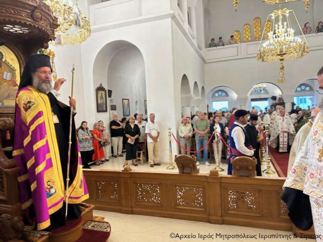 Επίσης ευχαρίστησε από καρδιάς τους παριστάμενους εκπροσώπους των τοπικών Αρχών, τον Α΄ Αντιπρόεδρο της Βουλής κ. Ιωάννη Πλακιωτάκη, τον Δήμαρχο Ιεράπετρας κ. Εμμανουήλ Φραγκούλη, τη Βουλευτή Λασιθίου κ. Κατερίνα Σπυριδάκη και τον Λιμενάρχη Ιεράπετρας κ. Ιωάννη Παπαδάκη, τα μέλη του Πολιτιστικού και Λαογραφικού Συλλόγου Ιεράπετρας «Κρητικός Χορός», που με τις παραδοσιακές φορεσιές τους πλαισίωσαν τις Τίμιες Κάρες των Αγίων, και τον προϊστάμενο του ναού Αρχιμ. Πορφύριο με τους συνεργάτες του. Ακόμα ευχαρίστησε τον Σύλλογο Ρεθυμνίων Μικρασιατών, τα μέλη του οποίου παρίσταντο στην πανήγυρη στο πλαίσιο προσκυνηματικής εκδρομής τους, οι οποίοι ακολούθησαν τον Σεβ. Ποιμενάρχη τους στην Ιεράπετρα.