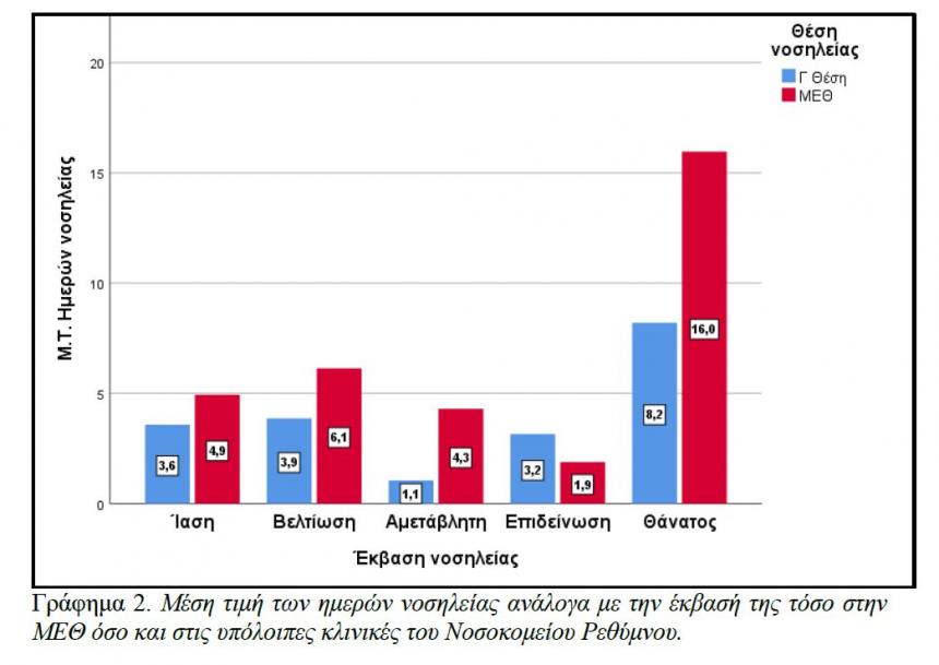 Η διάρκεια νοσηλείας κυμάνθηκε από 0 έως και 340 ημέρες και η μέση τιμή της ήταν οι 3,6 ημέρες. Την μεγαλύτερη μέση τιμή διάρκειας (21,1) την είχαν οι νοσηλείες για Ψυχικές διαταραχές και διαταραχές συμπεριφοράς και ακολουθούν οι Τραυματισμοί, δηλητηριάσεις κλπ και ο covid-19 (Μ.Τ.=6,4 η κάθε μία από τις δυο αιτίες). Ακόμα τρεις αιτίες (Παθήσεις του μυοσκελετικού συστήματος, Λοιμώδη και παρασιτικά νοσήματα και οι Παθήσεις του αναπνευστικού συστήματος) είχαν μέση τιμή ημερών νοσηλείας μεταξύ 5 και 4,5. Παρατηρήθηκε, στις κλινικές εκτός ΜΕΘ, αρνητική στατιστικά σημαντική συσχέτιση μεταξύ της έκβασης της νοσηλείας και του αριθμού των ημερών της. Το γεγονός αυτό σημαίνει ότι όσο μεγαλύτερη σε διάρκεια ήταν η νοσηλεία τόσο καλύτερη ήταν η έκβαση της. Επίσης υπήρξε στατιστικά σημαντική διαφορά ανάμεσα σε κάθε κατηγορία έκβασης (ίαση, βελτίωση, αμετάβλητη, επιδείνωση και θάνατος) και των αντίστοιχων ημερών νοσηλείας. Από την άλλη πλευρά στην ΜΕΘ υπάρχει θετική στατιστικά σημαντική συσχέτιση μεταξύ της έκβασης και των ημερών νοσηλείας δηλαδή όσο αυξάνονται οι μέρες νοσηλείας αυξάνεται και η πιθανότητα χειρότερης έκβασης (Γράφημα 2). Από τα πιο πάνω δεδομένα απουσιάζει δυστυχώς η πληροφορία των διακομιδών (δεν καταγράφονται στην συγκεκριμένη έρευνα) που θα έδινε μια πιο σαφή εικόνα της κατάστασης του νοσοκομείου μας.
