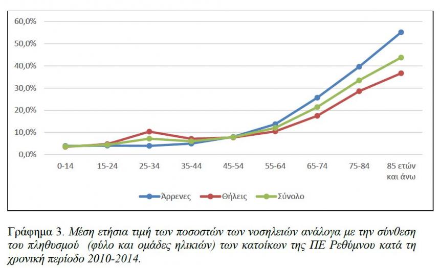 Από την ανάλυση των νοσηλειών που αφορούσαν τους μόνιμους κατοίκους της Π.Ε. Ρεθύμνου παρατηρήσαμε ότι η μέση τιμή του ποσοστού του πληθυσμού που νοσηλεύτηκε στο νοσοκομείο μας έστω και μία φορά σε ετήσια βάση ήταν 10,5%. Αυτό το ποσοστό σημείωσε όπως είναι λογικό σημαντικές διακυμάνσεις κατά φύλο και ομάδες ηλικιών. Το χαμηλότερο ποσοστό σημείωσαν οι θήλεις 0-14 ετών (3,5%) και το μεγαλύτερο οι άρρενες 85 ετών και άνω (55,2%) (Γράφημα 3). Ενώ η μέση ηλικία του πληθυσμού της ΠΕ Ρεθύμνου ήταν 38,9 έτη για τους άρρενες και 40,1 έτη για τις θήλεις η μέση ηλικία των νοσηλευομένων ήταν 59,5 και 55,9 έτη αντίστοιχα. Εάν από τις θήλεις αφαιρέσουμε την αιτία κύηση τοκετός λοχεία η μέση ηλικία τους ανέρχεται στα 59,9 έτη. Εδώ χρειάζεται να αναφέρουμε ότι ένα άτομο μπορεί να έχει νοσηλευτεί περισσότερες από μία φορές.
