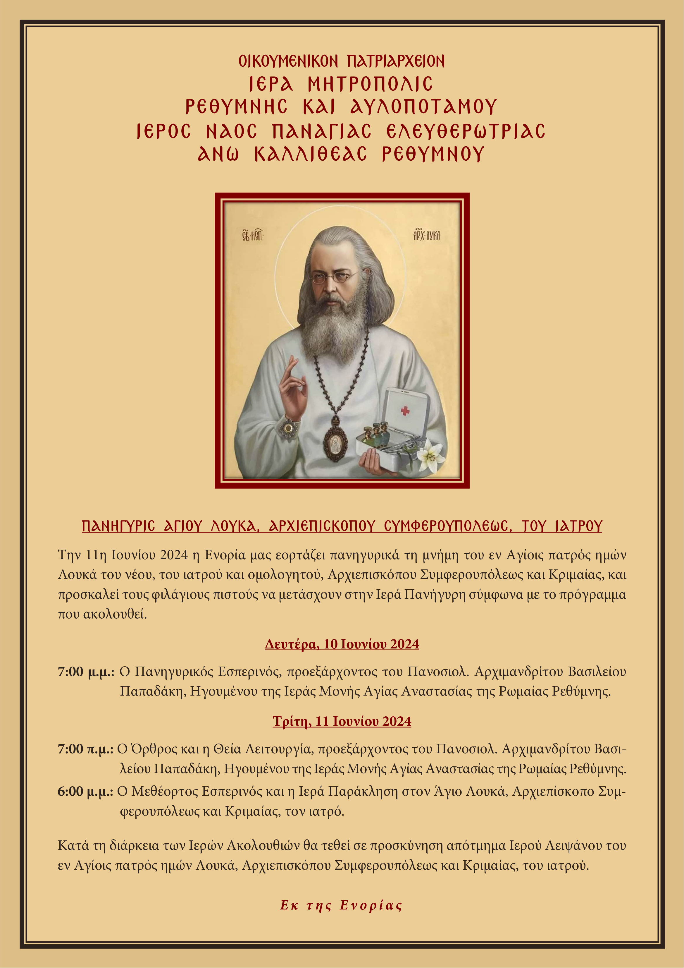Την 11η Ιουνίου 2024 η Ενορία μας εορτάζει πανηγυρικά τη μνήμη του εν Αγίοις πατρός ημών Λουκά του νέου, του ιατρού και ομολογητού, Αρχιεπισκόπου Συμφερουπόλεως και Κριμαίας, και προσκαλεί τους φιλάγιους πιστούς να μετάσχουν στην Ιερά Πανήγυρη σύμφωνα με το πρόγραμμα που ακολουθεί.