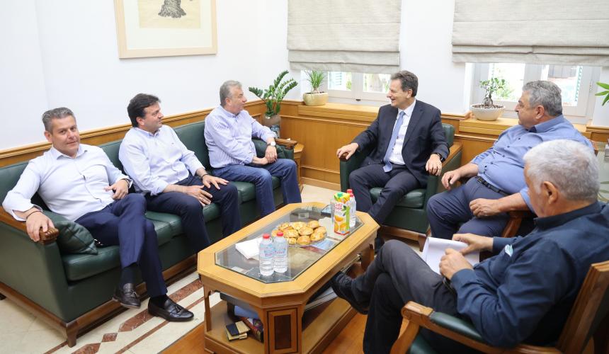 Ο Υπουργός Περιβάλλοντος και Ενέργειας επισκέφθηκε σήμερα τον Περιφερειάρχη Κρήτης Σταύρο Αρναουτάκη, όπου παρουσία των Αντιπεριφερειαρχών Νίκου Ξυλούρη, Νίκου Καλογερή, Νίκου Συριγωνάκη και στελεχών του Υπουργείου συζητήθηκαν όλα τα θέματα της Κρήτης που αφορούν στα ενεργειακά, τη διαχείριση του νερού και ευρύτερα θέματα περιβάλλοντος.