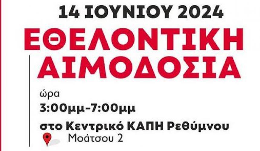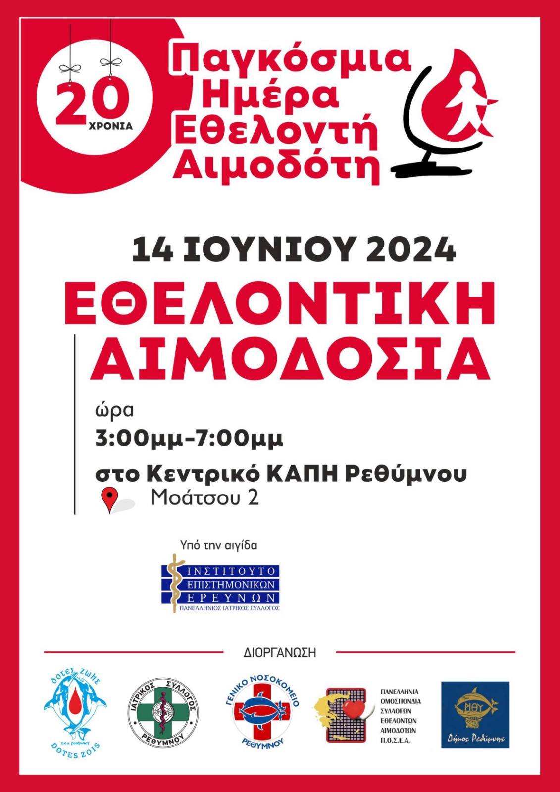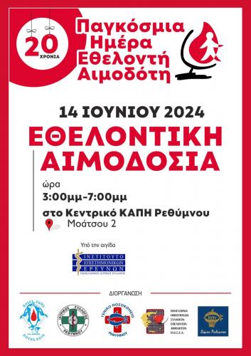Φέτος το Ρέθυμνο γιορτάζει στο Κεντρικό ΚΑΠΗ Ρεθύμνου στην οδό Μοάτσου αριθμός 2, με μια εθελοντική αιμοδοσία από 15:00 μέχρι 19:00 που συνδιοργανώνει ο Ιατρικός Σύλλογος Ρεθύμνου, με το τμήμα Αιμοδοσίας του Γ. Νοσοκομείου Ρεθύμνου, το Δήμο Ρεθύμνου και τους Δότες Ζωής, υπό την αιγίδα του Πανελλήνιου Ιατρικού Συλλόγου.