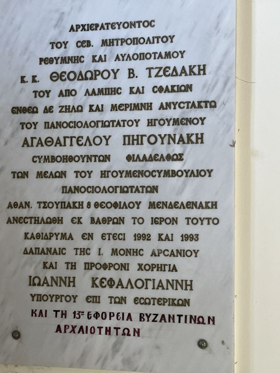 Το μεσημέρι της Τρίτης, 4ης Ιουνίου 2024, ο Σεβασμιώτατος Μητροπολίτης Ρεθύμνης και Αυλοποτάμου κ. Πρόδρομος, μαζί με τον Πανοσιολογιώτατο Αρχιμανδρίτη Ευφραίμ Μανουσάκη, Καθηγούμενο της Ιεράς Πατριαρχικής και Σταυροπηγιακής Μονής Αγίου Γεωργίου Αρσανίου, υποδέχθηκαν στην εν λόγω Ιερά Μονή την ερίτιμο κ. Αναστασία Τζιγκουνάκη, Προϊσταμένη της Εφορείας Αρχαιοτήτων Ρεθύμνου, και τον αξιότιμο κ. Κωνσταντίνο Γιαπιτσόγλου, αρχαιολόγο, με τους οποίους, κατόπιν επιτόπιας αυτοψίας στους χώρους της Μονής, είχαν συνεργασία για την προώθηση και ολοκλήρωση των διαδικασιών με σκοπό την εκ βάθρων ανακαίνιση, κατ’ αρχάς του Καθολικού της, καθώς και των λοιπών χώρων της ιστορικής αυτής Ιεράς Μονής.