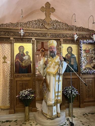 Προ της απολύσεως της Θείας Λειτουργίας, ο Σεβασμιώτατος Μητροπολίτης μας κ. Πρόδρομος εξέφρασε τις ευχαριστίες του στον Ηγούμενο της Ιεράς Μονής Βωσάκου, Πανοσιολ. Αρχιμανδρίτη Τιμόθεο Παναγιωτάκη, για το σπουδαίο έργο που επιτελεί στη Μονή και στα Ιερά της Μετόχια, και αναφέρθηκε στους κεκοιμημένους ανακαινιστές του ιστορικού αυτού και μοναδικού Ιερού Ναού των Αγίων Πατέρων, οι οποίοι συνέβαλαν στην ανακαίνιση του Ιερού αυτού Μετοχίου κατά το έτος 1973. Επίσης, ο Σεβασμιώτατος ευχαρίστησε την οικογένεια των Χνάρηδων για την πλούσια δοχή και την αβραμιαία φιλοξενία προς τους πολυπληθείς προσκυνητές, τονίζοντας προς όλους την ανάγκη να μένομε εντός του αδιαιρέτου Σώματος του Χριστού, της Αγίας μας Εκκλησίας, και να πορευόμαστε εκεί αγωνιζόμενοι με πίστη, υπακοή και αγάπη.