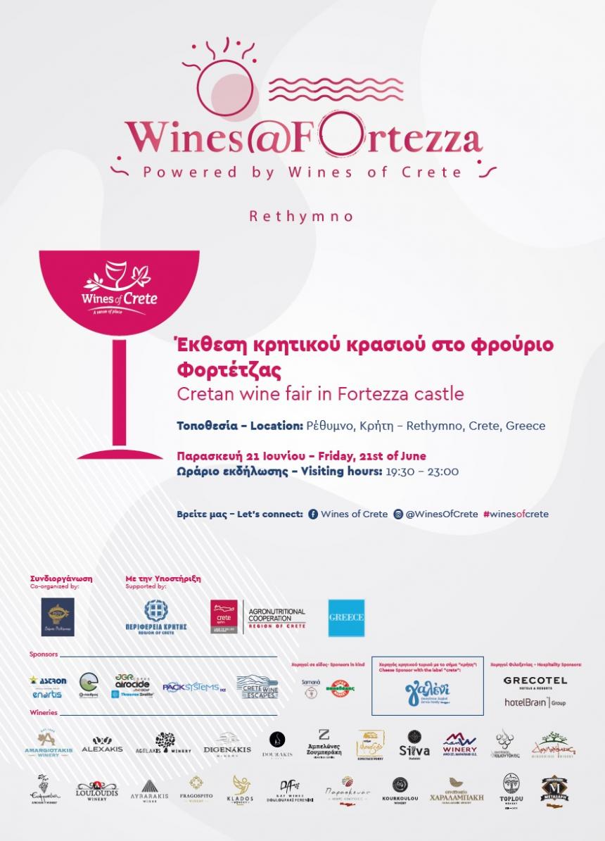Στην εκδήλωση γευσιγνωσίας Wines of Crete @ Fortezza που θα λάβει χώρα στο Φρούριο Φορτέτζα στο Ρέθυμνο, οινόφιλοι αλλά και επαγγελματίες του οίνου θα έχουν την ευκαιρία να απολαύσουν πάνω από 200 ετικέτες από επώνυμο, εμφιαλωμένο κρητικό κρασί από οινοποιεία μέλη του Δικτύου Οινοποιών Κρήτης. Οι επισκέπτες θα έχουν μια μοναδική ευκαιρία να δοκιμάσουν κρητικές και διεθνείς ποικιλίες, νέες και παλαιές εσοδείες, αλλά και να γνωρίσουν από κοντά τους ίδιους τους οινοπαραγωγούς.