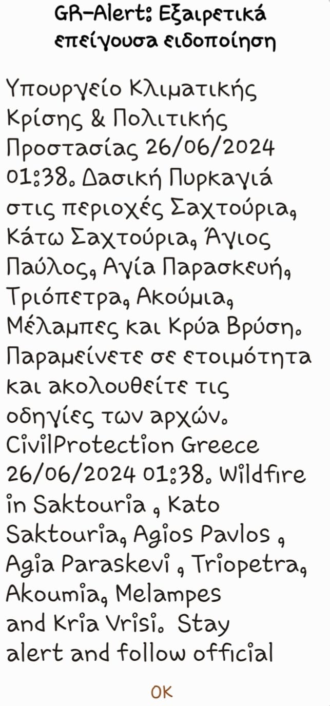 Στη 1:38 μετά τα μεσάνυκτα εκδόθηκε GR-ALERT για τα χωριά και τις περιοχές Σακτούρια, Κάτω Σακτούρια, Άγιος Παύλος, Αγία Παρασκευή, Τριόπετρα, Ακούμια, Κρύα Βρύση και Μέλαμπες, να βρίσκονται όλοι οι κάτοικοι σε ετοιμότητα και να ακολουθήσουν τις οδηγίες των αρμόδιων αρχών.