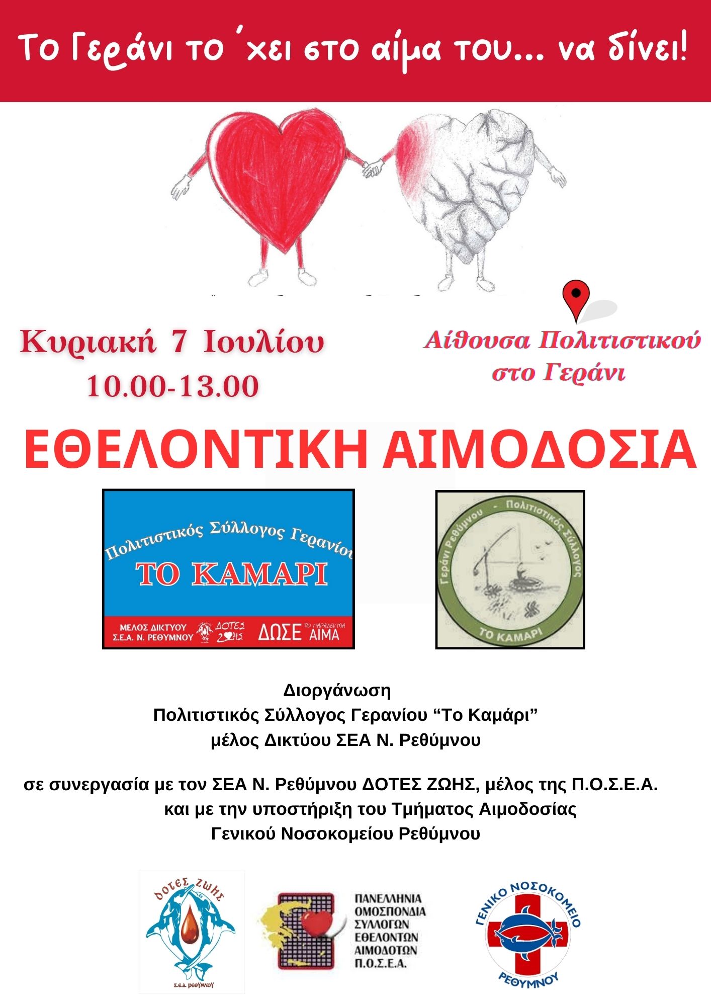 Εθελοντή αιμοδοσία θα πραγματοποιηθεί την Κυριακή 7 Ιουλίου 2024 από τις 10π.μ. έως τις 1μμ στο Γεράνι, στην αίθουσα που στεγάζεται ο Πολιτιστικός Σύλλογος Γερανίου ''Το Καμάρι'', μέλος του δικτύου του ΣΕΑ Ν. Ρεθύμνης «ΔΟΤΕΣ ΖΩΗΣ» με το γνωστό σύνθημα: