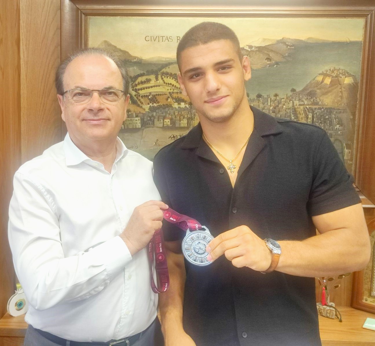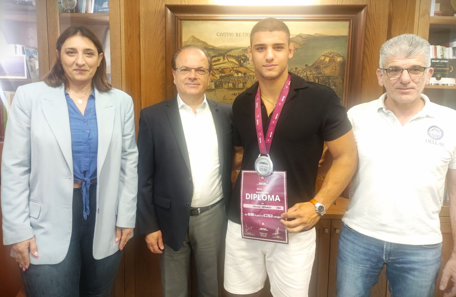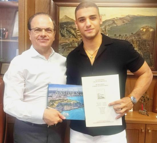 Τον Ρεθυμνιώτη Πρωταθλητή Πάλης Νίκο Καραβάνο υποδέχθηκε σήμερα στο Δημαρχείο ο Δήμαρχος Ρεθύμνης κ. Γιώργης Μαρινάκης για να τον συγχαρεί από κοντά για την κατάκτηση του ασημένιου μεταλλίου στον Πανευρωπαϊκό Πρωτάθλημα Πάλης που διεξήχθη προσφάτως στη Σερβία.