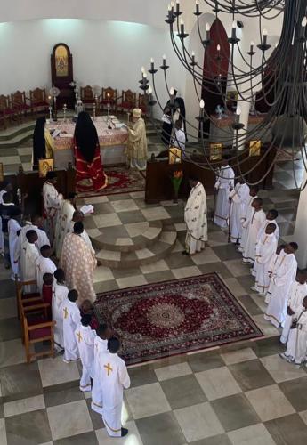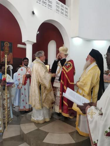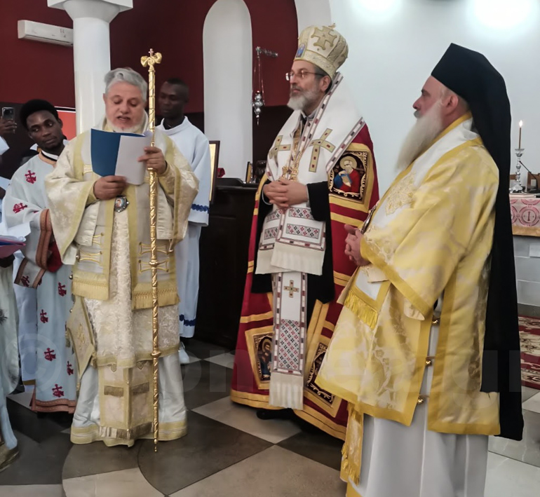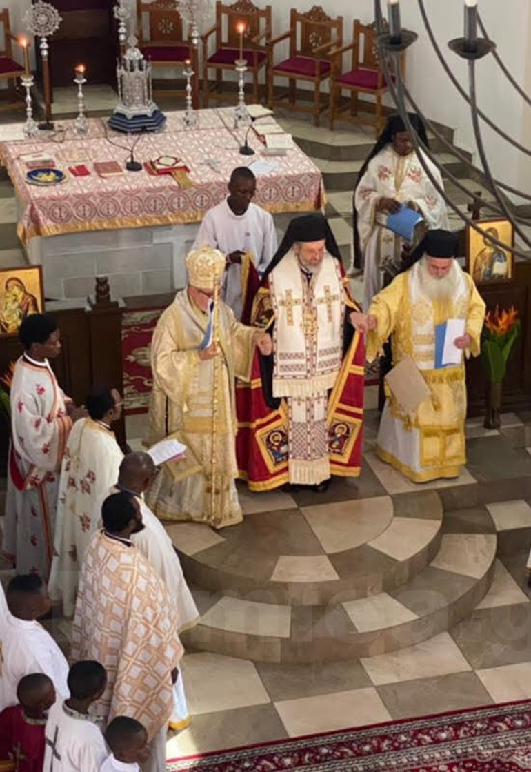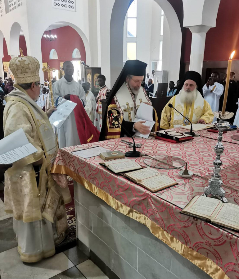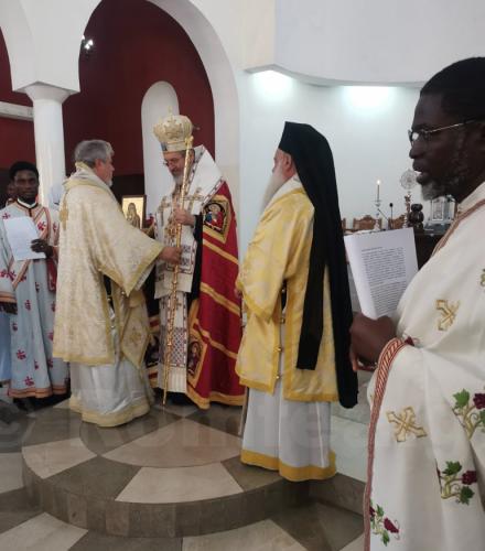 Στο Ιερό Βήμα τέλεσε την δέηση όπως ορίζει το τυπικό και ακολούθως εξήλθε στην Ωραία Πύλη όπου ο π. Ιάκωβος Miayokela ανέγνωσε την Πατριαρχική εγκύκλιο.