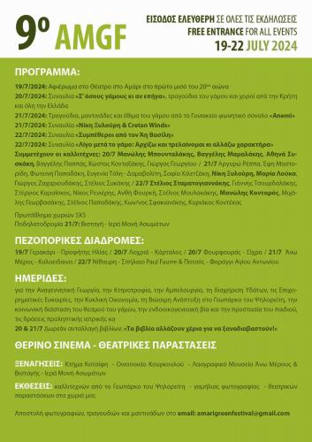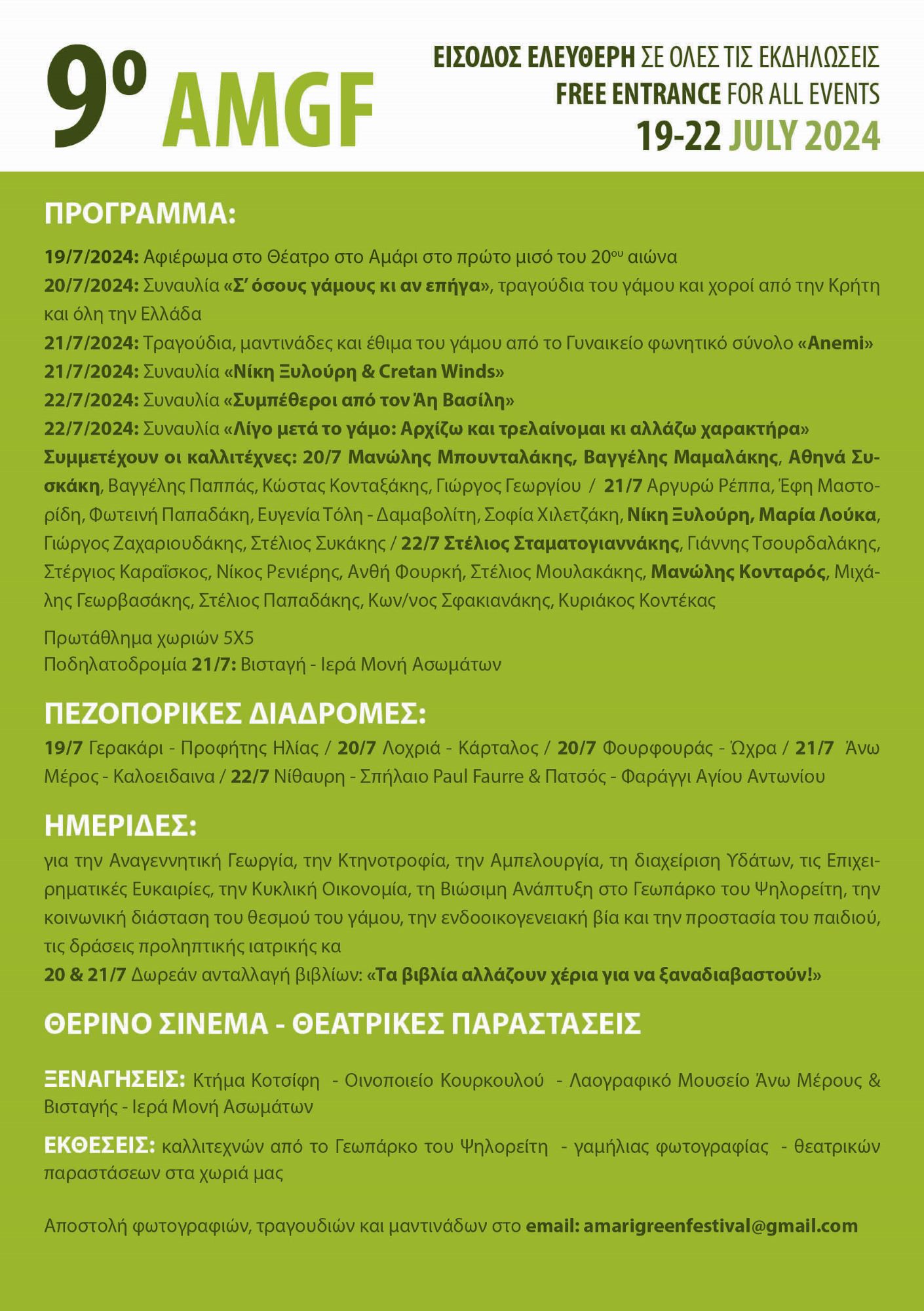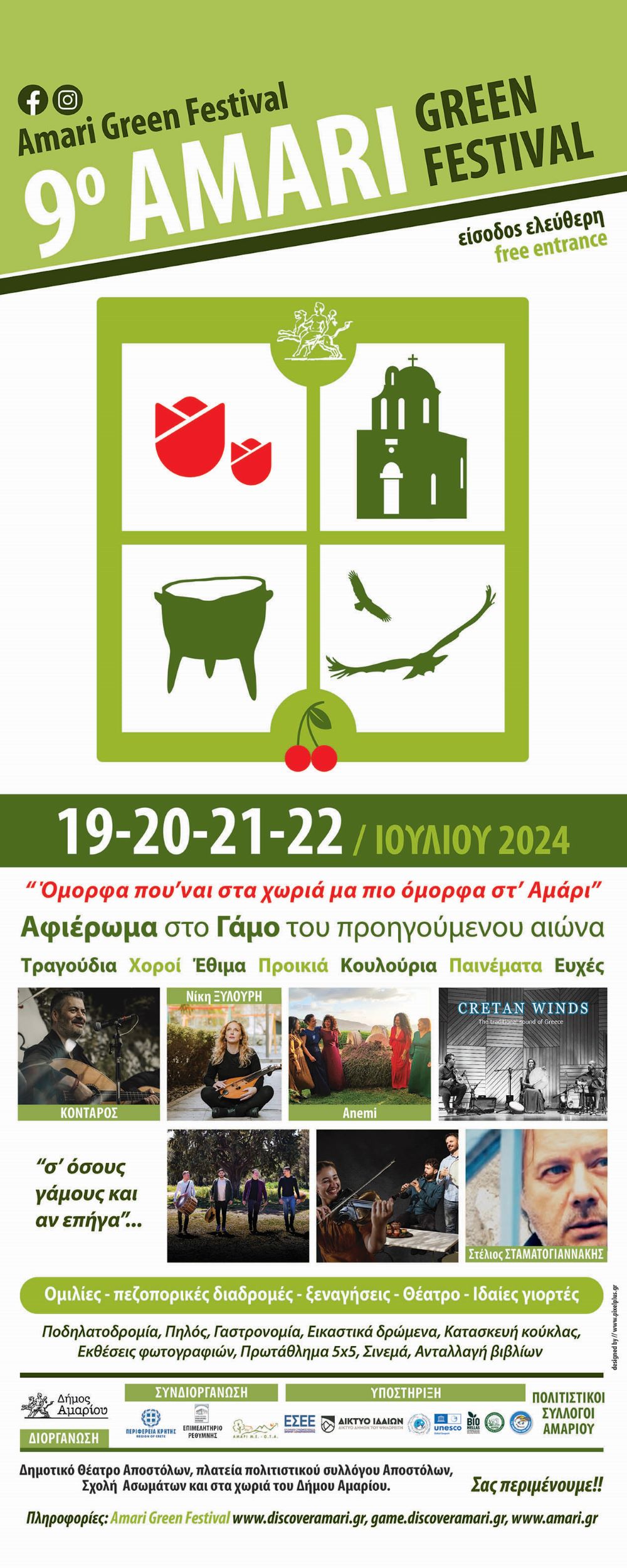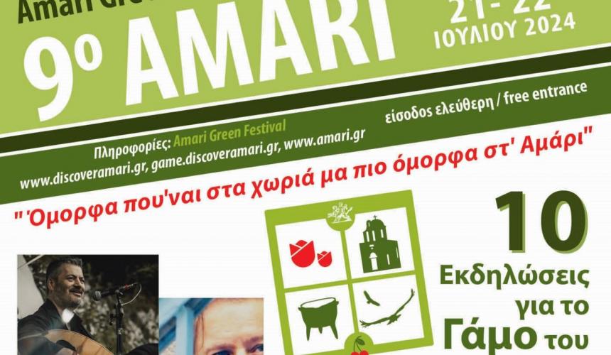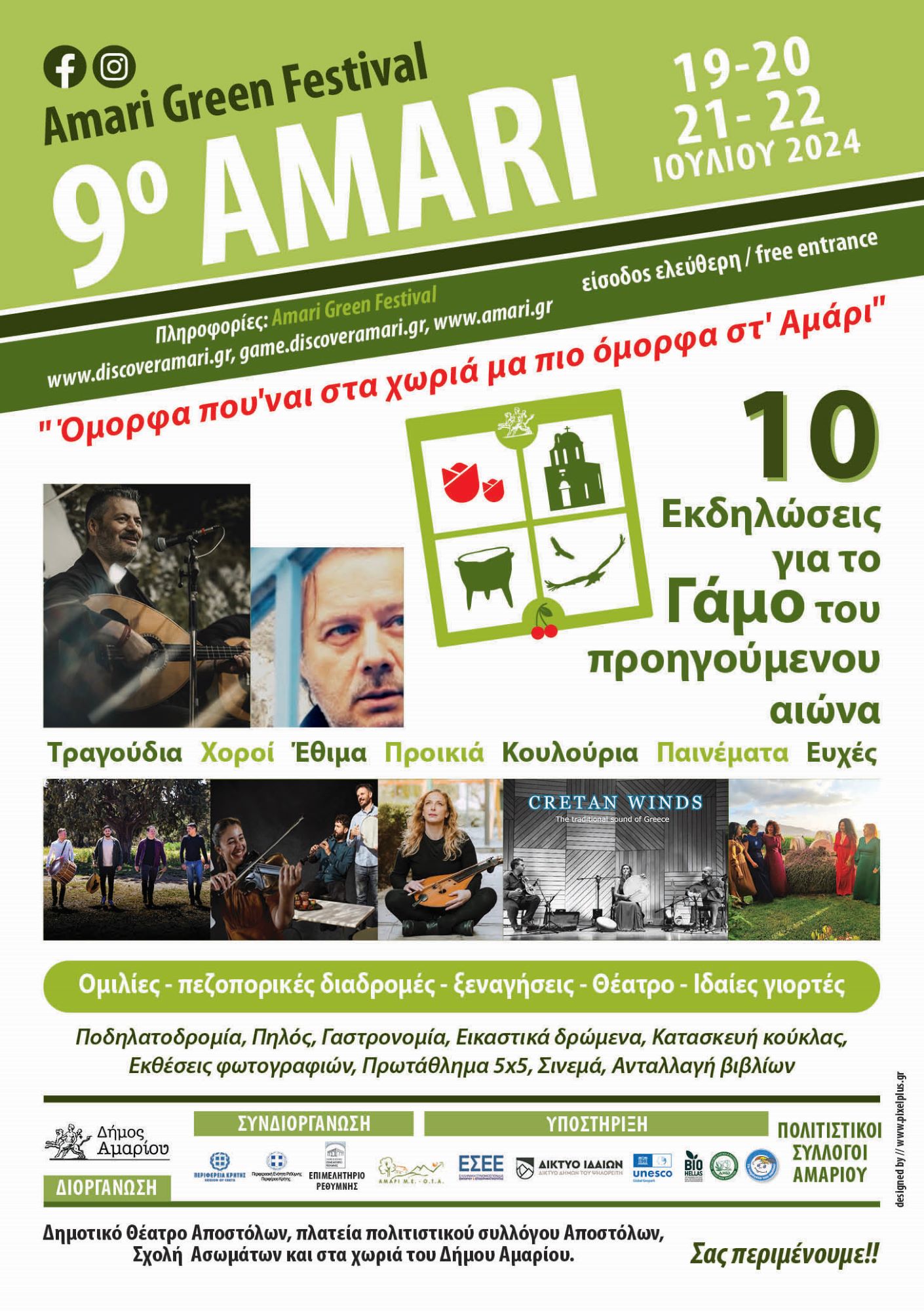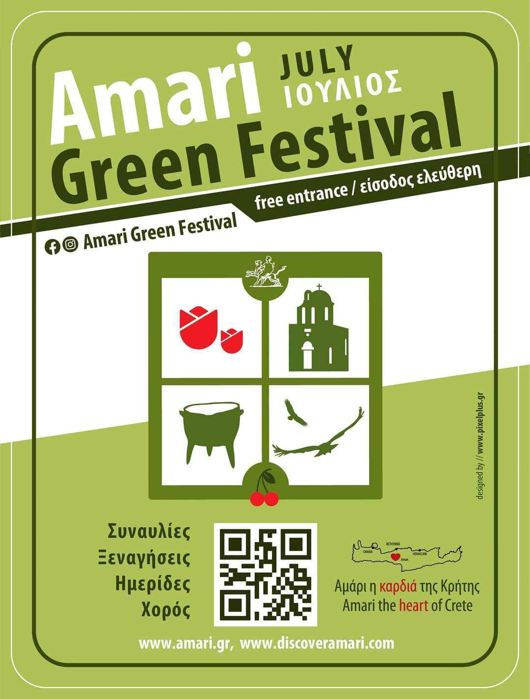 Το 9ο Amari Green Festival, όπως τονίζουν οι διοργανωτές, υπόσχεται τέσσερις ημέρες γεμάτες δράσεις, πολιτισμό και διασκέδαση. «Σε συνεργασία με πάνω από δεκαπέντε Πολιτιστικούς Συλλόγους, καλλιτέχνες, μουσικούς, χορευτές, επιστήμονες και εθελοντές, το φεστιβάλ συμβάλλει στην προώθηση της τοπικής κουλτούρας και της αειφόρου ανάπτυξης. Σας περιμένουμε όλους να ζήσουμε μαζί αυτή τη μοναδική εμπειρία! Σας περιμένουμε όλους να γιορτάσουμε μαζί την παράδοση και την καινοτομία, στο πανέμορφο και φιλόξενο Αμάρι!», αναφέρουν.