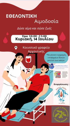 Μέσα στην περίοδο του Ιουλίου κα συγκεκριμένα την Κυριακή 14 Ιουλίου συντελέστηκε με τοn καλύτερο τρόπο άλλη μια αιμοδοσία γι΄ αυτήν τη χρόνια στο κοινοτικό γραφείο Αρχοντικής Ρεθύμνου.