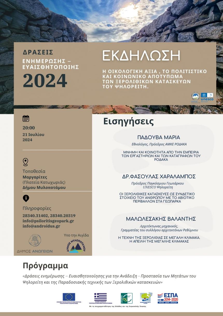 Η εκδήλωση πραγματοποιείται στο πλαίσιο υλοποίησης του έργου ενταγμένου στο πρόγραμμα LEADER: «Δράσεις ενημέρωσης – Ευαισθητοποίησης για την Ανάδειξη - Προστασία των μητάτων του Ψηλορείτη και της παραδοσιακής τεχνικής των ξερολιθικών κατασκευών» και αποτελεί συνεργασία του Δικτύου Ιδαίων Δήμων, του Δήμου Ανωγείων, υπό την αιγίδα του Δήμου Μυλοποτάμου.