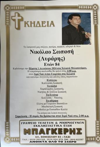 Ο Νίκος Σωπασής γεννήθηκε στα Χελιανά, χωριό στον Μέσα Μυλοπόταμο, όπου και θα ταφεί την Πέμπτη 1 Αυγούστου στις 4 το απόγευμα.
