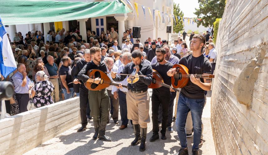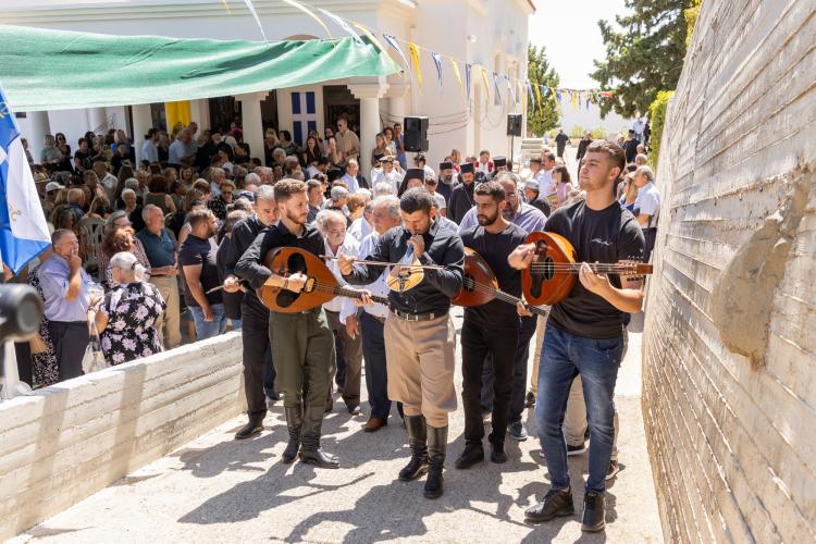 Μετά την ανταλλαγή των αναμνηστικών δώρων της ημέρας ακολούθησε Ιερή Λιτανεία πέριξ του Ναού και έγινε η απόλυσις της Θείας Λειτουργία για να ακολουθήσει μικρή μουσική εκδήλωση με ένα τραγούδι των Αγίων, σε στίχους του μακαριστού Νίκο Μαργαρίτη. Η εκδήλωση στο Ναό έκλεισε με ένα χορό των βρακοφόρων μελών του Λαογραφικού Ομίλου Χρήστου Τζανιδάκη. Ακολούθησε η μετάβαση όλου του εκκλησιάσματος δια της «Στράτας των Αγίων Τεσσάρων Μαρτύρων» -όπως για πρώτη φορά ονομάστηκε η νέα διαδρομή από τον Ιερό Ναό μέχρι την αίθουσα του Πολιτιστικού Συλλόγου- όπου και προσφέρθηκε σε όλους εορταστική φιλοξενία, που είχαν ετοιμάσει η Ενορία και οι φορείς του χωριού, με τη βοήθεια ανδρών, γυναικών και νέων του χωριού.