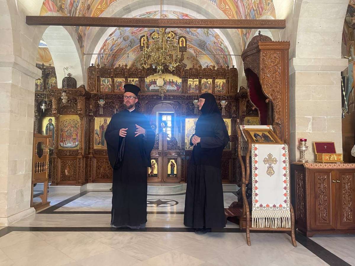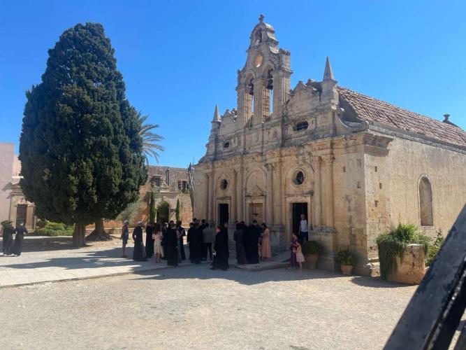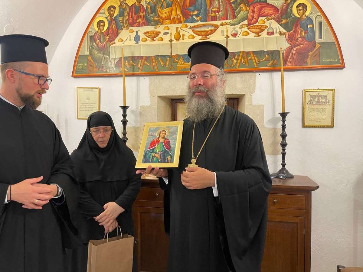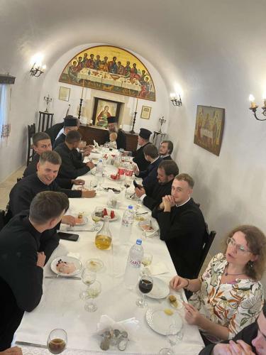 Ακολούθως, οι Ουκρανοί Φοιτητές επισκέφθηκαν την Ιερά Μονή Αγίας Ειρήνης Ρεθύμνης, όπου, στο Καθολικό, τους υποδέχθηκαν ο Σεβασμιώτατος Μητροπολίτης Ρεθύμνης και Αυλοποτάμου κ. Πρόδρομος μαζί με την Καθηγουμένη Γερόντισσα Θέκλα και την Αδελφότητα της Μονής. Οι επισκέπτες ενημερώθηκαν για την ιστορία της Ιεράς Μητροπόλεως και της εν λόγω Ιεράς Μονής και στη συνέχεια τους παρετέθη γεύμα στη μοναστηριακή τράπεζα, όπου αντηλλάγησαν προσφωνήσεις και αναμνηστικά δώρα.