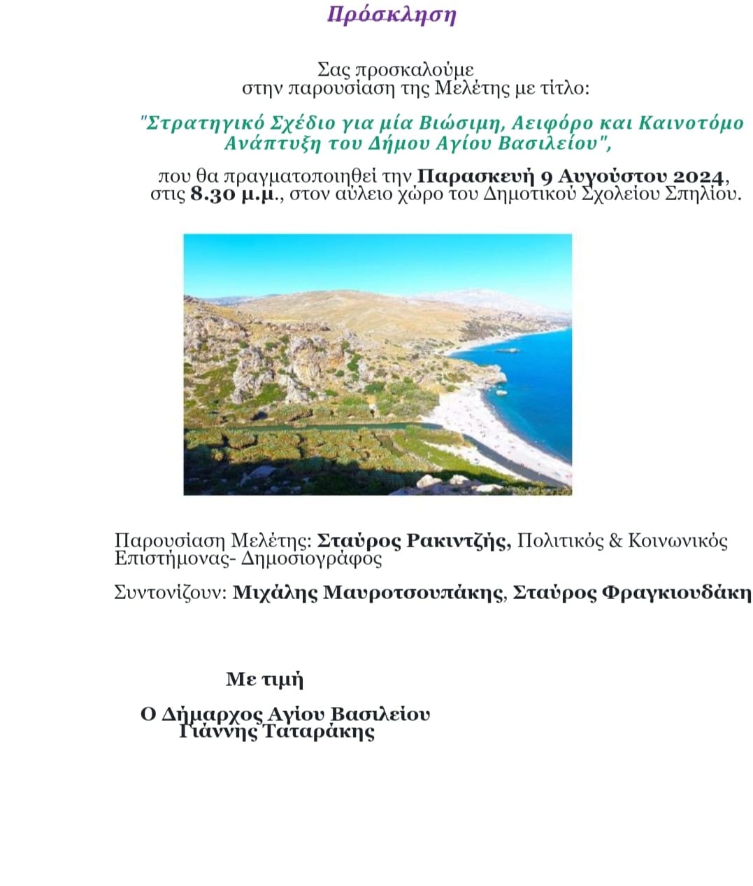 Η παρουσίαση της μελέτης θα γίνει από τον κ. Σταύρο Ρακιντζή, Πολιτικό & Κοινωνικό Επιστήμονα – Δημοσιογράφο, ο οποίος είναι και ο συντάκτης του σχεδίου, ενώ συντονιστές της εκδήλωσης θα είναι οι κ. Μιχάλης Μαυροτσουπάκης και κ. Σταύρος Φραγκιουδάκης.
