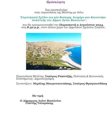 Το Στρατηγικό σχέδιο για μία Βιώσιμη, Αειφόρο και Καινοτόμο Ανάπτυξη του Δήμου Αγίου Βασιλείου παρουσιάζεται την ερχόμενη Παρασκευή 9 Αυγούστου στον αύλειο χώρο του Δημοτικού Σχολείου Σπηλίου στις 20:30.