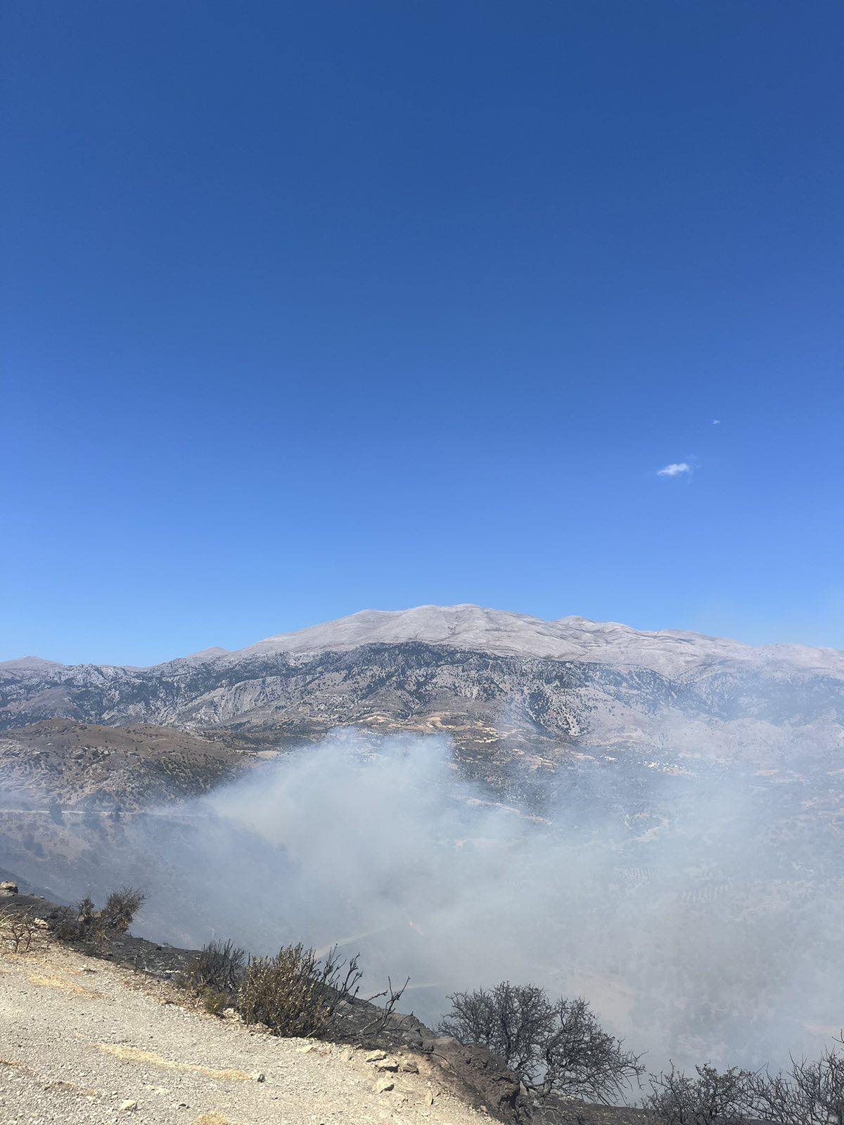 Ισχυρές δυνάμεις της Πυροσβεστικής Υπηρεσίας δίνουν μάχη με τις φλόγες προκειμένου να ελέγξουν το μεγάλο πύρινο μέτωπο της φωτιάς στην περιοχή του Αμαρίου.