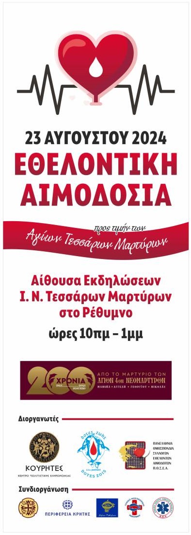 Μία εκδήλωση που διοργανώνει Σύλλογος Εθελοντών Αιμοδοτών Ν. Ρεθύμνου «ΔΟΤΕΣ ΖΩΗΣ, Πανελλήνια Ομοσπονδία Συλλόγων Εθελοντών Αιμοδοτών Π.Ο.Σ.Ε.Α. σε συνεργασία με την Ιερά Μητρόπολη Ρεθύμνης & Αυλοποτάμου και τους «ΚΟΥΡΗΤΕΣ» - Κέντρο Πολιτιστικής Κληρονομιάς.