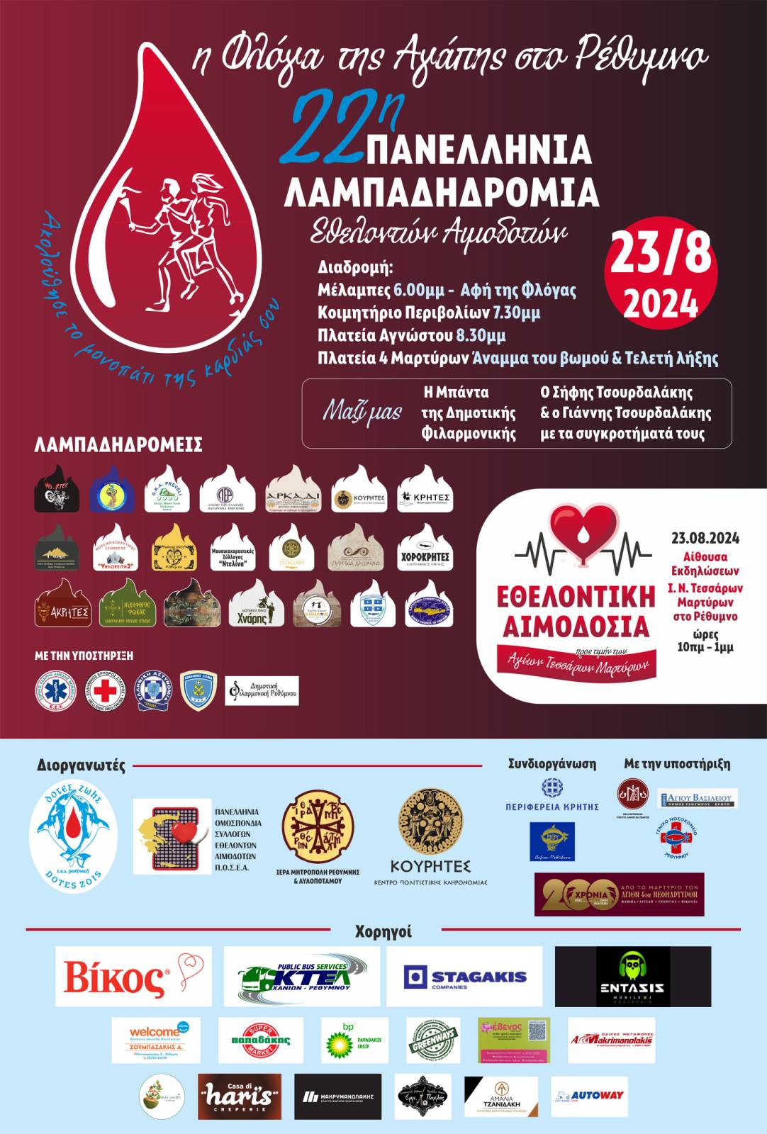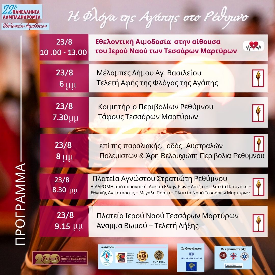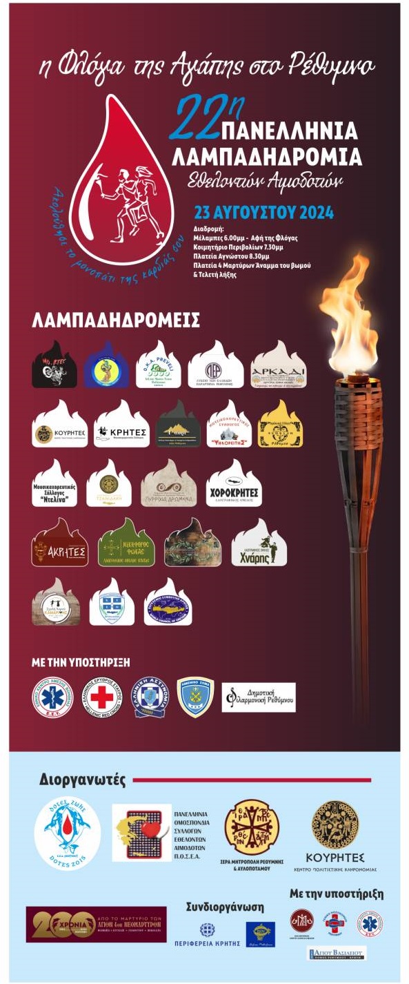 Με μεγάλη χαρά ανακοινώνουμε την έναρξη της 22ης Λαμπαδηδρομίας Εθελοντών Αιμοδοτών στον Νομό Ρεθύμνου, Κρήτης! Η Φλόγα της Αγάπης περνάει από το Ρέθυμνο και σας καλούμε να συμμετέχετε σ΄ αυτήν την ξεχωριστή εκδήλωση που αναδεικνύει τη σημασία της εθελοντικής αιμοδοσίας και την αξία της προσφοράς προς τον συνάνθρωπο. Ας διαδώσουμε μαζί μηνύματα ζωής, μηνύματα αλληλεγγύης τιμώντας παράλληλα και τα 200 χρόνια από το Μαρτύριο των Αγίων Τεσσάρων Μαρτύρων στο Ρέθυμνο.