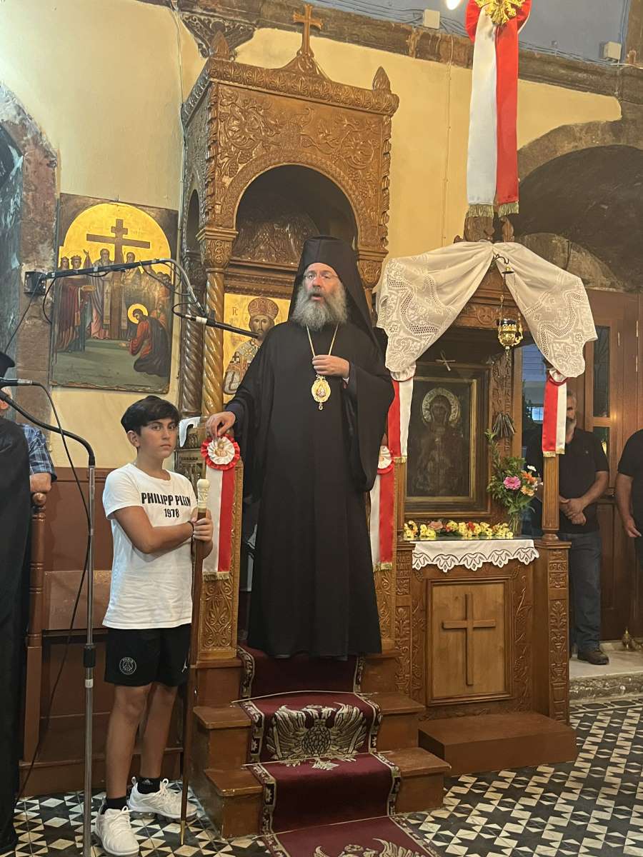Προ της απολύσεως, ο Εφημέριος της Ενορίας, Πανοσ. Αρχιμανδρίτης Ρωμανός Αναστασιάδης, προσφώνησε τον Σεβασμιώτατο με θερμούς και καρδιακούς λόγους, καλωσορίζοντάς τον στην πρώτη του αυτή ποιμαντική επίσκεψη, και του προσέφερε, εκ μέρους της Ενορίας, Ιερό Αρχιερατικό Εγκόλπιο με τη μορφή της Υπεραγίας Θεοτόκου.
