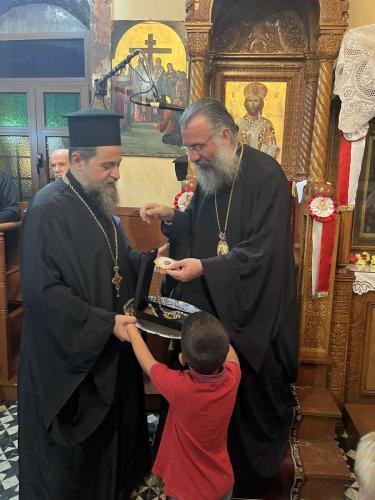 Ο Επίσκοπός μας συνεχάρη για την ομορφιά και την επιστασία του Ιερού Ναού τόσο τον Εφημέριο π. Ρωμανό, που διακονεί και γραμματειακώς παρά τον Μητροπολίτη, όσο και το Εκκλησιαστικό Συμβούλιο, τους Ιεροψάλτες και όλους τους Ενορίτες, για την προσφορά τους στην Αγία μας Εκκλησία, και ευχαρίστησε για το πολύτιμο δώρο, τονίζοντας ότι το πολυτιμότερο δώρο είναι πάντοτε η αγάπη των ανθρώπων στον Χριστό και στην Εκκλησία. Τέλος, ευχήθηκε πάντοτε να έχομε ευκαιρίες ιερού συναπαντήματος εντός της Αγίας μας Εκκλησίας.