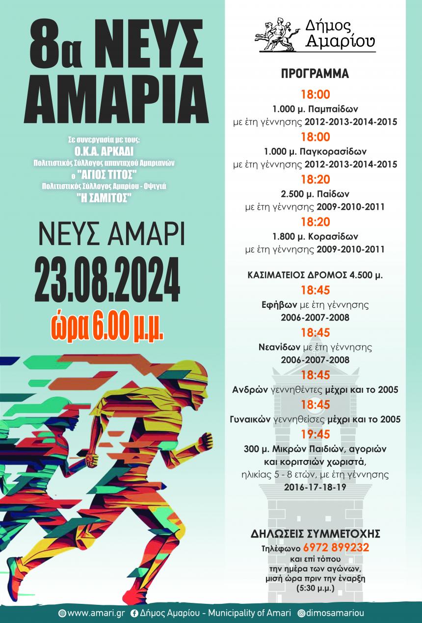 Ο Δήμος Αμαρίου, σε συνεργασία με τον Πολιτιστικό Σύλλογο απανταχού Αμαριανών «Άγιος Τίτος», τον Πολιτιστικό Σύλλογο Αμαρίου - Οψιγιά «Η Σαμιτός» και τον Ο.Κ.Α. Αρκάδι, ανακοινώνει με μεγάλη χαρά τη διοργάνωση των αγώνων δρόμου «8α ΝΕΥΣΑΜΑΡΙΑ» την Παρασκευή, 23 Αυγούστου 2024. Η εκδήλωση θα λάβει χώρα στο πανέμορφο Νευς Αμάρι και εντάσσεται στο πλαίσιο των εορταστικών εκδηλώσεων προς τιμήν του Αγίου Τίτου.