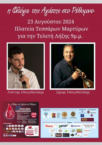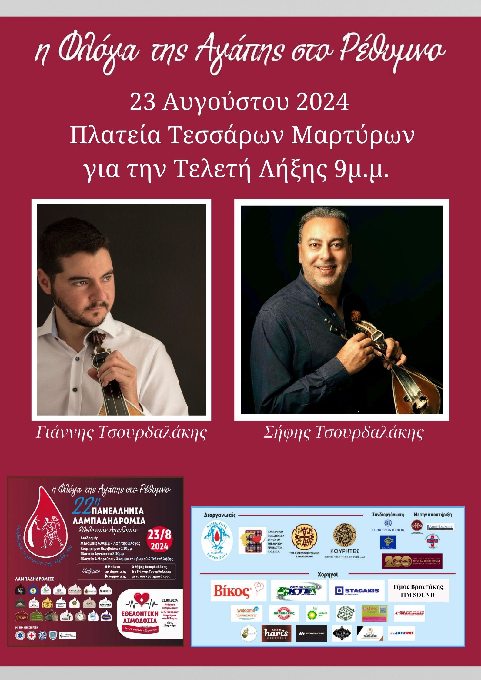 Μέσα από τους ήχους της κρητικής λύρας θα ταξιδέψει στο Ρέθυμνο και σε όλη την Ελλάδα το μήνυμα της εθελοντικής αιμοδοσίας, το μήνυμα της προσφοράς των Αγίων Τεσσάρων Μαρτύρων. Ευχαριστούμε το συγκρότημα του Γιάννη και του Σήφη Τσουρδαλάκη από τις Μέλαμπες Ρεθύμνου για τη συμμετοχή τους!