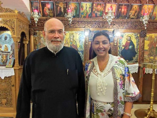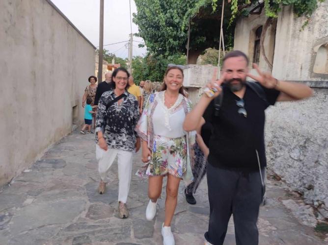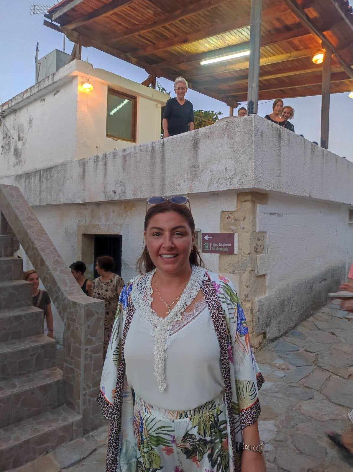 Την υποδέχθηκε ο εφημέριος π. Νικόλαος Ρουσσάκης, ο οποίος και την ξενάγησε στο ναό, που ως μνημείο του 13ου αιώνα εντυπωσίασε την Έλενα Παπαρίζου, η οποία έδειξε αμέσως ενδιαφέρον να ενημερωθεί για την ιστορία του. Αφού ξεναγήθηκε μέσα στον ιστορικό ναό, επισκέφθηκε τα μουσεία και περιηγήθηκε στα ενετοκρητικά σοκάκια του παλιού χωριού, δηλώνοντας ενθουσιασμένη!