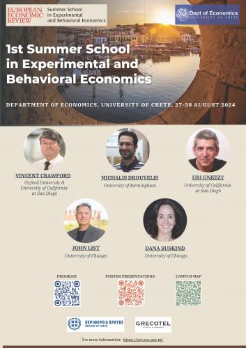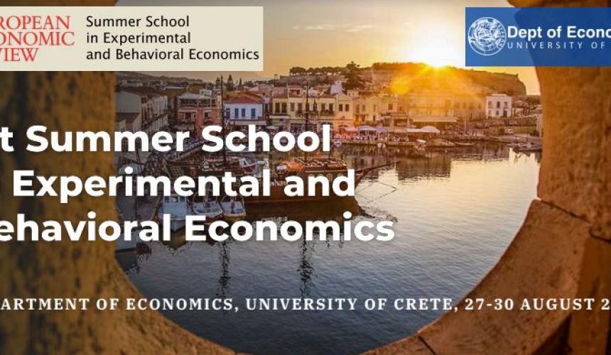 Το Τμήμα Οικονομικών Επιστημών του Πανεπιστημίου Κρήτης διοργανώνει διεθνές Θερινό Σχολείο με τίτλο "1st Summer School in Experimental and Behavioral Economics", από τις 27 έως και τις 30 Αυγούστου 2024. Κατά τη διάρκεια του Θερινού Σχολείου θα πραγματοποιηθούν διαλέξεις προς διδακτορικούς και μεταπτυχιακούς φοιτητές από κορυφαίους στον κόσμο ακαδημαϊκούς στα Πειραματικά και Συμπεριφορικά Οικονομικά, ενώ θα λάβει χώρα και ένα ερευνητικό Workshop. Επίσης, οι φοιτητές θα έχουν την ευκαιρία να παρουσιάσουν τις δικές τους εργασίες σε poster sessions.