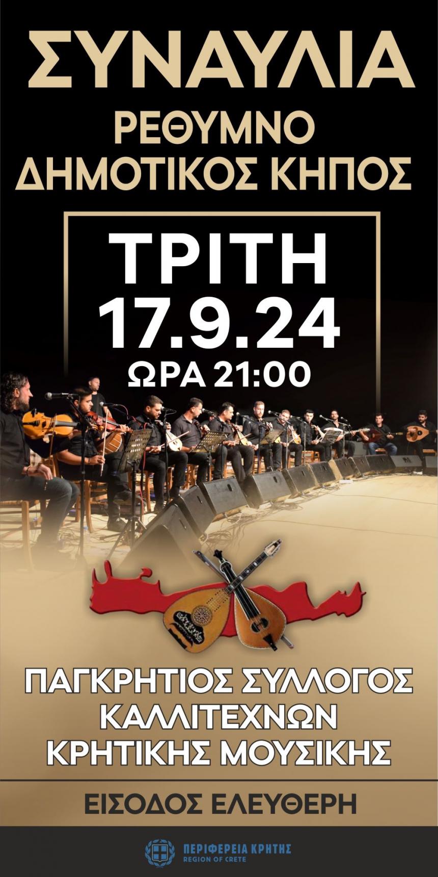 Ο Παγκρήτιος Σύλλογος Καλλιτεχνών Κρητικής Μουσικής (Π.Σ.Κ.Κ.Μ.), πιστός στο ραντεβού του με τη μουσική παράδοση του τόπου μας, συνδιοργανώνει με την Περιφέρεια Κρήτης, δύο ακόμα συναυλίες για το φετινό καλοκαίρι στην Κρήτη.