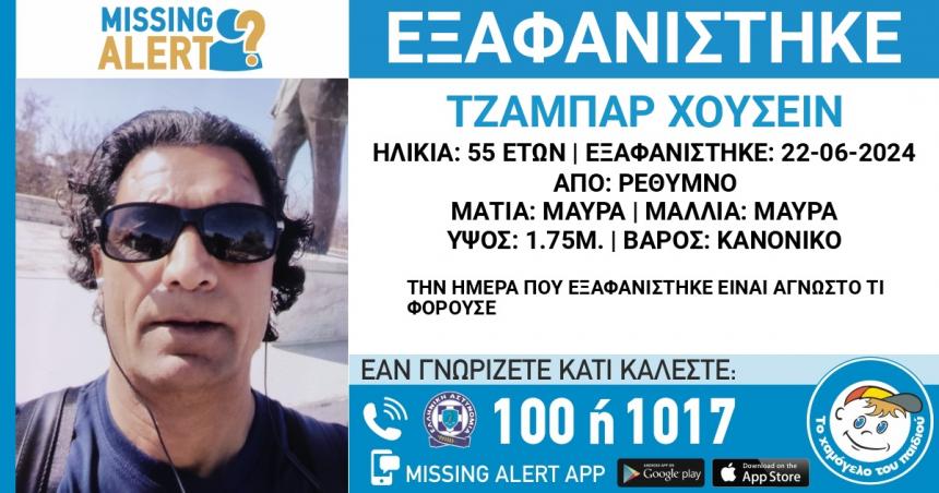 Στις 22/06/2024 εξαφανίστηκε από την περιοχή του Ρεθύμνου ο Τζαμπάρ(ον.) Χουσείν (επ.), 55 ετών.