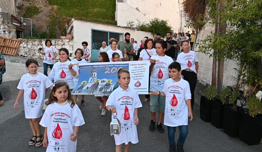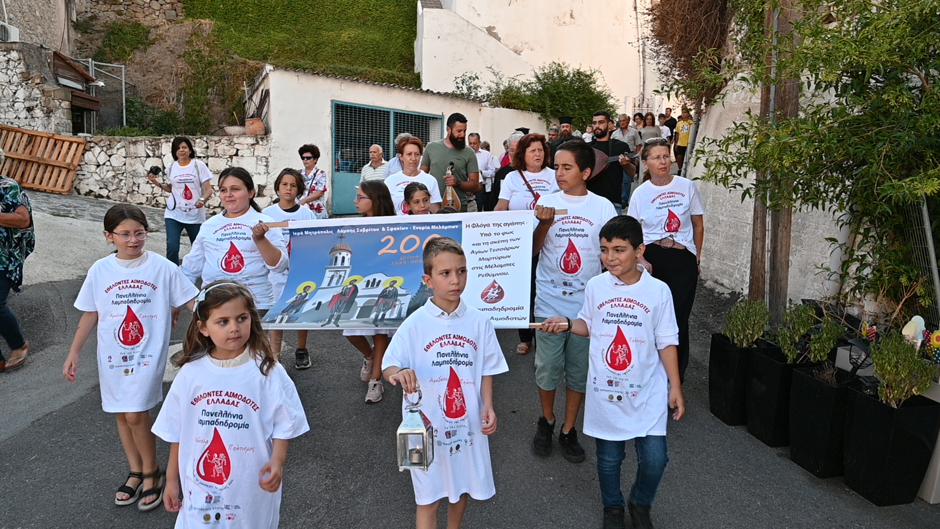 Με το πέρας του Εσπερινού σχηματίστηκε Πομπή που είχε κεφαλή τα παιδιά που φορούσαν τις φανέλες της 22ης Λαμπαδηδρομίας της Φλόγας της Αγάπης, κρατούσαν την Αφίσσα της Λαμπαδηδρομίας με αποτυπωμένη τη δάδα και τους Τέσσερεις Σαλβαρωμένους Αγίους Μάρτυρας. Άλλο παιδί κρατούσε το φανάρι με το φως από το καντήλι των Αγίων. Αμέσως μετά ακολουθούσαν όλοι οι μεγάλοι σε μια συνηθισμένη για τις Μέλαμπες μουσική παρέα με αρχή τους οργανοπαίκτες και πίσω όλοι οι υπόλοιποι– γυναίκες και άνδρες- στη θέση και στο ρόλο των τραγουδιστάδων, που τραγουδούσαν όλοι μαζί με μια φωνή τα γνωστά πλέον στο χωριό τραγούδια των Αγίων, «Ελάστε να γυρέψομε ούλα τα πάνω μέρη…» και «Πως φεύγει ο νούς και χάνεται τ’αθρώπου πότες-πότες και σ’εποχές βολοκοπά αλλοτινές και πρώτες ;..» Η πομπή διέσχισε όλο το χωριό μέχρι που κατέληξε στον μοναδικό σε θέα αύλιο χώρο του καθεδρικού Ι. Ναού των Αγίων Τεσσάρων Μαρτύρων, όπου και ανέμεναν οι εκπρόσωποι του συλλόγου «Δότες Ζωής», των Λαογραφικών συλλόγων και μέλη της μηχανοκίνητης Ομάδας «Μόρτες». Αφού ο Εφημέριος της Ενορίας, π. Ευάγγελος Τσουρδαλάκης, καλωσόρισε όλους τους προσκυνητές των Αγίων 4 Μαρτύρων και φίλους του εθελοντισμούστις Μέλαμπες και στην εκδήλωση, υπογράμμισε ότι πολύ εύστοχα η φετινή λαμπαδηδρομία τέθηκευπό το φως και τη σκέπη των Αγίων, δεδομένου ότι η καλλιέργεια του πνεύματος της εθελοντικής αιμοδοσίας, αποτελεί κατ’ αναλογίαν μίμηση της θυσίας του αίματος των Αγίων, γιατί μοναδικό κίνητρο και τα δύο γεγονότα έχουν την αγάπη προς το Θεό και προς το συνάνθρωπο. Ακολούθησε η ανταλλαγή δώρων από την Ενορία Μελάμπων προς τους εκπροσώπους των Συλλόγων, και από τον εκπρόσωπο του Σύλλογου «Δότες Ζωής» Πρωτοπρεσβύτερο π. Γεώργιο Γαλεράκη προς την Ενορία Μελάμπων και τον Δήμο Αγίου Βασιλείου για την στήριξη του θεσμού της εθελοντικής αιμοδοσίας. Η εκδήλωση έληξε με την παράδοση της φλόγας από το καντήλι του Ιερού Ναού των Αγίων 4 Μαρτύρων προς τους λαμπαδηδρόμους οι οποίοι και πήραν το δρόμο για τους τάφους των Αγίων στα Περιβόλια και τον Ιερό Ναό τους στο κέντρο του Ρεθύμνου, όπου και ολοκληρώθηκαν οι εκδηλώσεις .